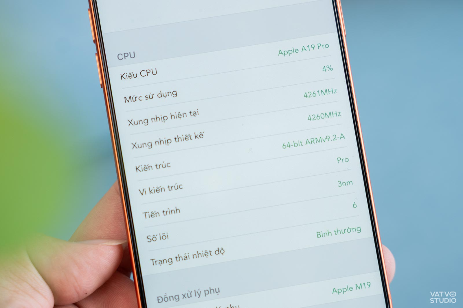 Apple A19 Pro là con chip cao cấp được sản xuất trên tiến trình 3 nm TSMC. Cấu trúc của con chip này có 6 lõi CPU với kiến trúc 2 lõi hiệu năng cao và 4 lõi cân bằng. Phiên bản mình đang sử dụng là iPhone 17 Pro Max, vì thế con chip trang bị trên đây sẽ có 6 lõi GPU.