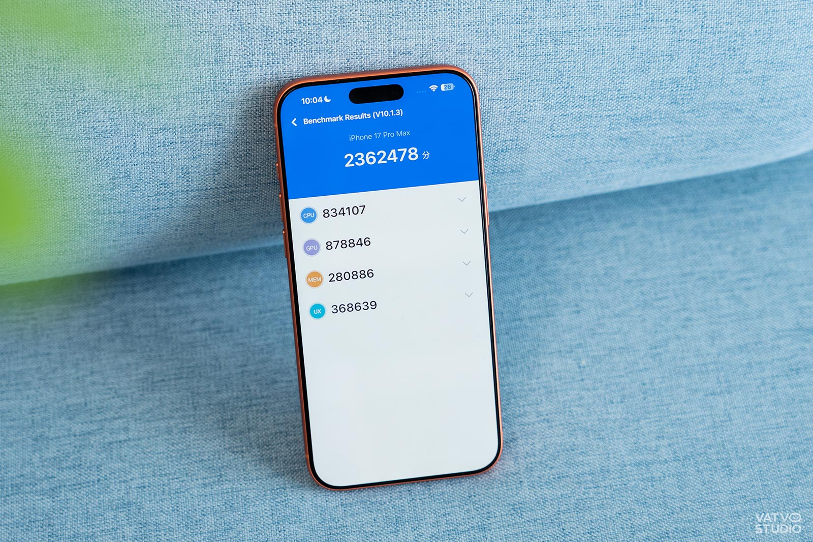 Với điểm số AnTuTu Benchmark v10, iPhone 17 Pro Max đạt khoảng 2,36 triệu điểm, trong đó có khoảng 878 nghìn điểm GPU. So với thế hệ trước đây là iPhone 16 Pro Max (khoảng 1,9 triệu điểm), điểm số AnTuTu Benchmark trên máy tăng khoảng 20%.