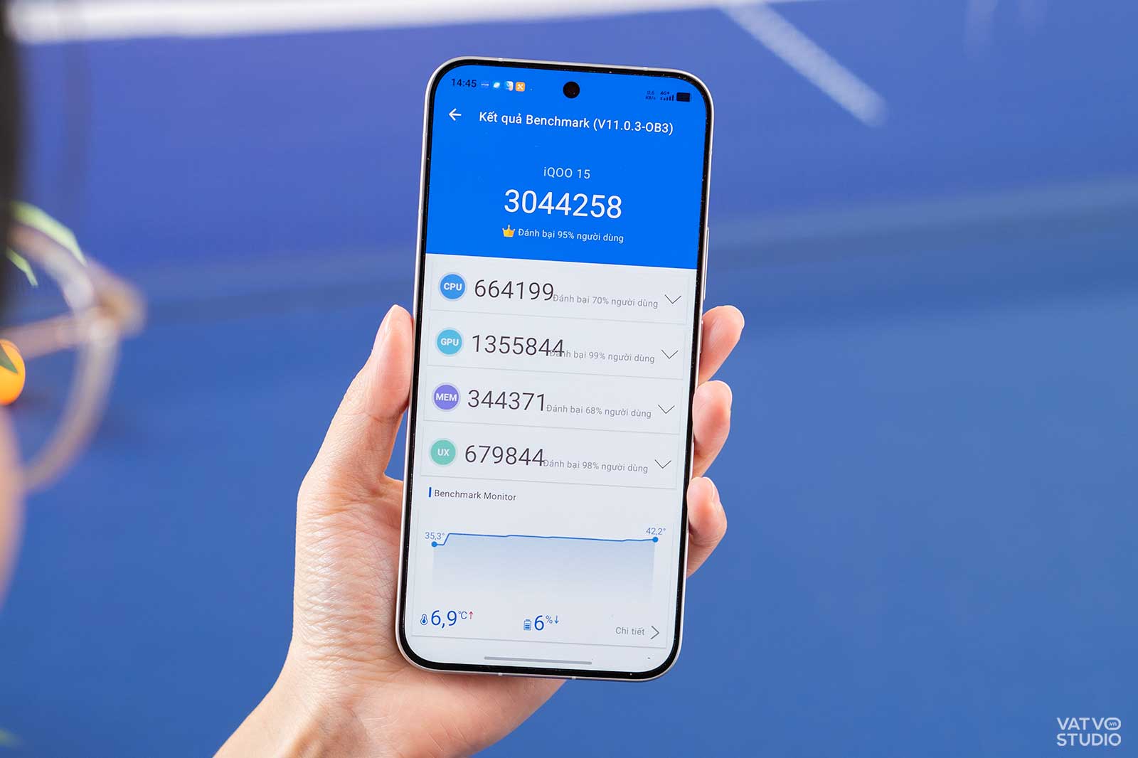Tuy nhiên, trong bài thử nghiệm AnTuTu Benchmark, iQOO 15 chỉ đạt một con số khá khiêm tốn so với kỳ vọng, dừng lại ở mức 3,04 triệu điểm. Khi tìm hiểu kỹ hơn, mình phát hiện ra rằng điểm số tổng bị kéo xuống chủ yếu là do hai yếu tố: điểm bộ nhớ (Memory) và điểm trải nghiệm người dùng (UX) đang ở mức khá thấp. Có thể lý giải điều này là do iQOO 15 là một thiết bị mới ra mắt, phần mềm hệ thống có thể chưa được tối ưu hoàn toàn để đạt được điểm số cao và ổn định như các mẫu máy khác đã ra mắt một thời gian.