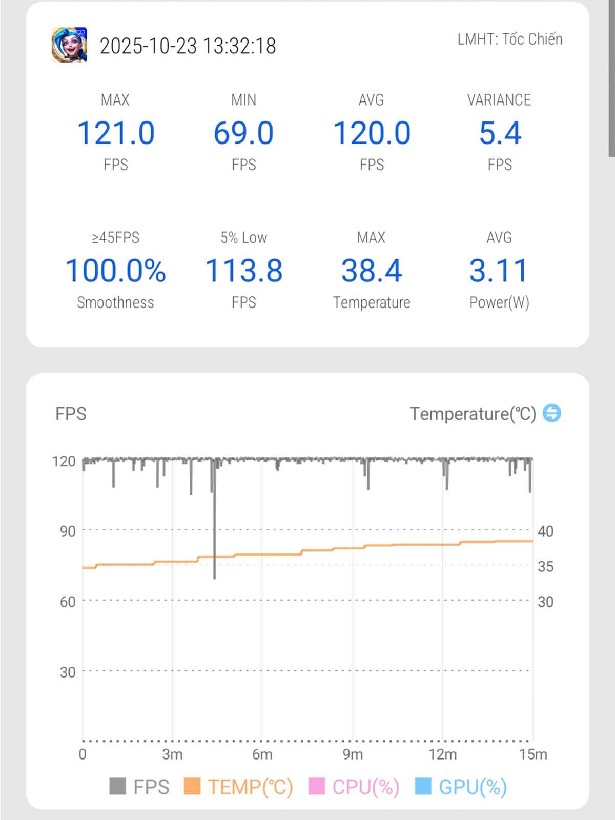 Với tựa game LMHT: Tốc Chiến, mình thiết lập đồ họa ở mức cao nhất và kích hoạt tốc độ khung hình 120 FPS. Xuyên suốt màn chơi, máy cho ra hiệu năng ổn định, với mức FPS trung bình đạt đều ở con số 120. Biểu đồ FPS gần như là một đường thẳng. Mình chỉ ghi nhận có đúng một đoạn nhỏ máy bị sụt giảm (drop) khung hình xuống khoảng 70 FPS, tuy nhiên ngay lập tức phục hồi về mốc 120 FPS và duy trì ổn định, đều đặn cho đến cuối màn chơi.