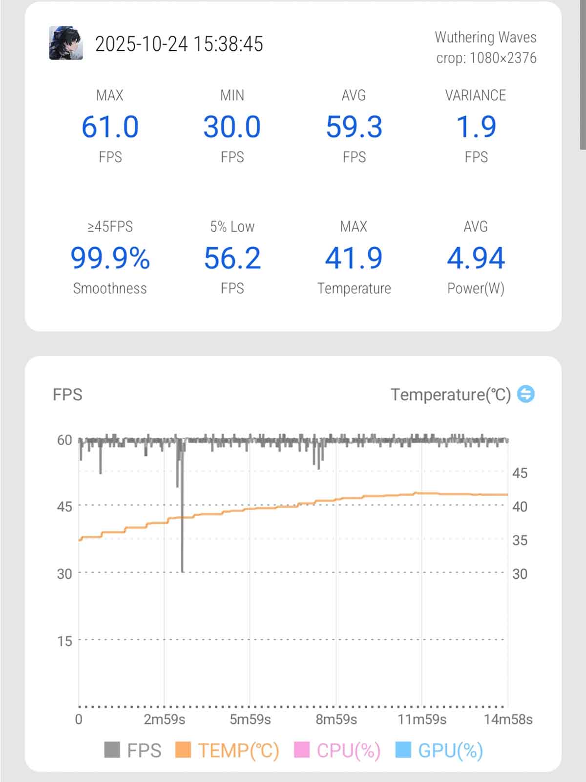 | Wuthering Waves (Cực cao + Độ phân giải siêu cao + 60FPS) | 59,3 | Mặt trước: 39,6 độ C Mặt sau: 38 độ C |