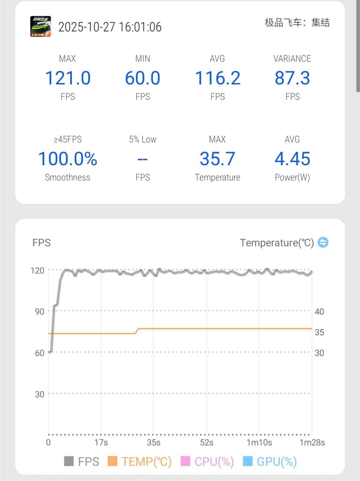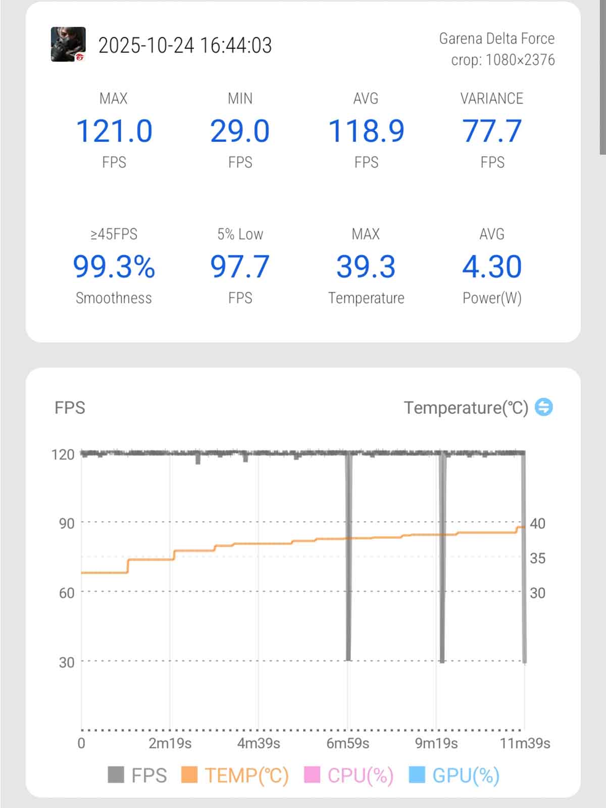 | Delta Force (Tiêu chuẩn + 120FPS) | 118,9 | Mặt trước: 37,3 độ C Mặt sau: 35,5 độ C |
