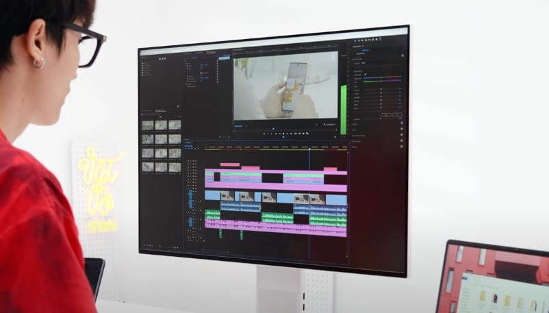 Với tỉ lệ 3:2, edit video thì có thể hiện được đến 14 layer video và 4 layer audio trên màn hình. Trong After Effect có thêm nhiều không gian để hiển thị thêm các thanh công cụ, làm việc nhanh chóng hơn. Khi tùy chỉnh nhiều keyframe cùng 1 lúc cũng dễ dàng hơn rất nhiều. Chẳng phải phóng to, thu nhỏ, không phải kéo giữa 2 màn hình. Không gian rộng của MateView sẽ là chìa khóa giúp mình đạt năng suất công việc hiệu quả hơn.