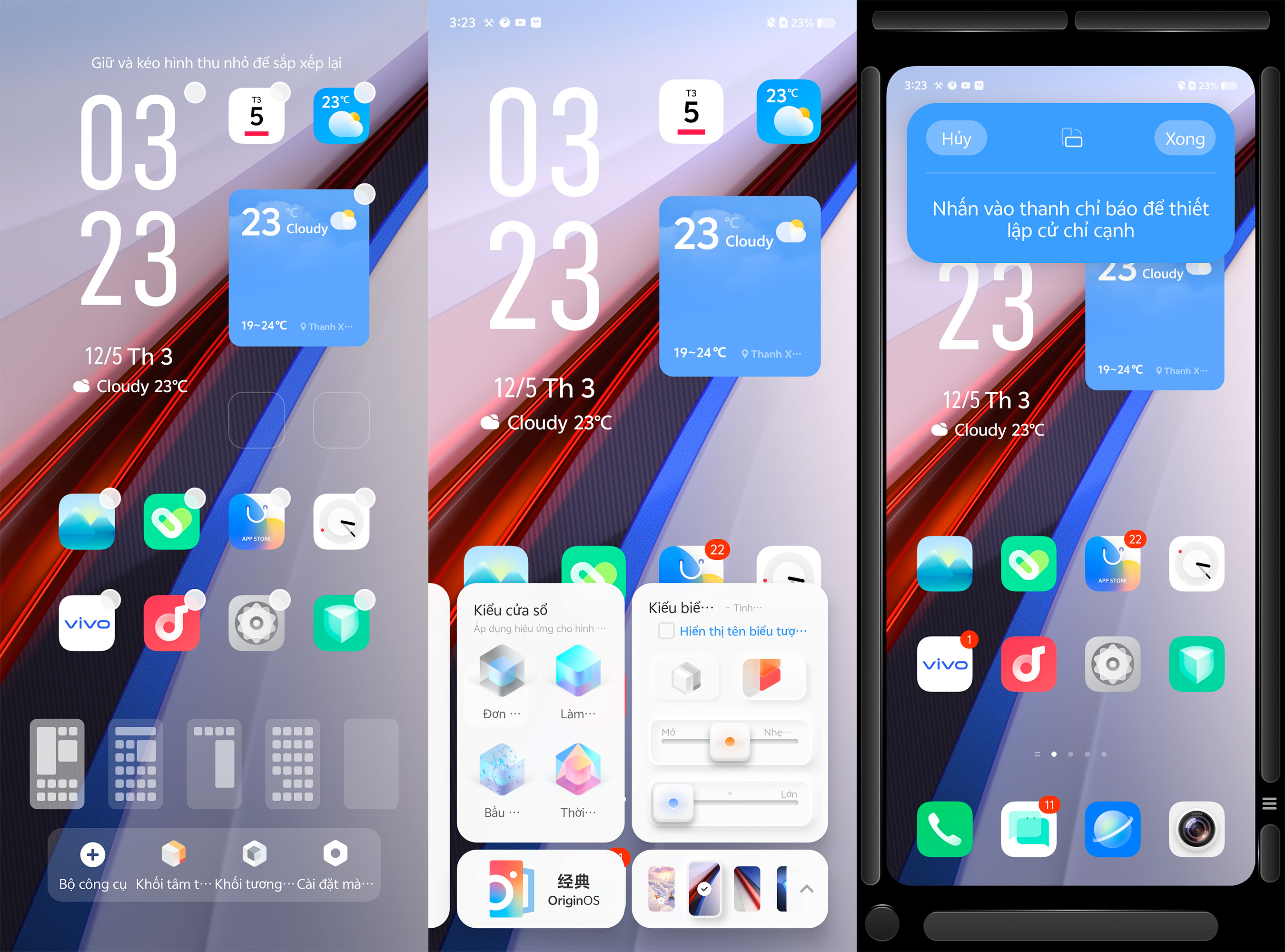 Thứ hai, một số cài đặt trong OriginOS hiển thị khá rối và không trực quan. Ở giao diện Cài đặt màn hình chính, iQOO 12 Pro có hai tuỳ chọn là Khối tâm trạng và Khối tương tác. Với Khối tâm trạng, hãng để rất nhiều tuỳ biến khác nhau như biểu tượng ứng dụng, kiểu cửa sổ hay màu hệ thống. Trong khi, cài đặt mình dùng nhiều nhất là thay đổi hình nền lại nằm ở một góc rất nhỏ và khó thao tác. Với Khối tương tác, vivo cũng tích hợp rất nhiều cài đặt liên quan đến cử chỉ vuốt. Trên thực tế, đây là những thiết lập ít dùng và hoàn toàn có thể truy cập từ ứng dụng Cài đặt.