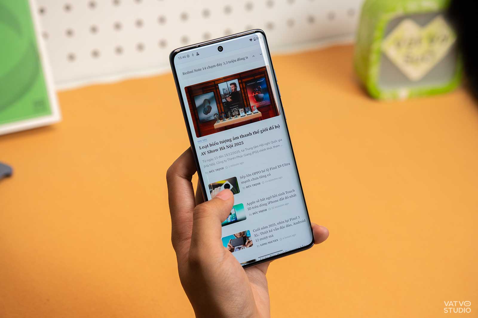 Một lo ngại thường thấy ở màn hình cong là vấn đề chạm nhầm, nhưng trong suốt quá trình sử dụng thực tế, mình rất ít khi gặp phải tình trạng này dù màn hình cong khá sâu. Về khả năng hiển thị ngoài trời, với độ sáng tối đa 1.400 nits và có thể đạt đỉnh 4.500 nits khi xem nội dung HDR, mình thấy máy hiển thị rất ổn và trực quan, nội dung vẫn rõ ràng ngay cả dưới ánh sáng mạnh. Ngoài ra, tần số quét 120Hz giúp mọi thao tác vuốt chạm của mình đều diễn ra mượt mà.