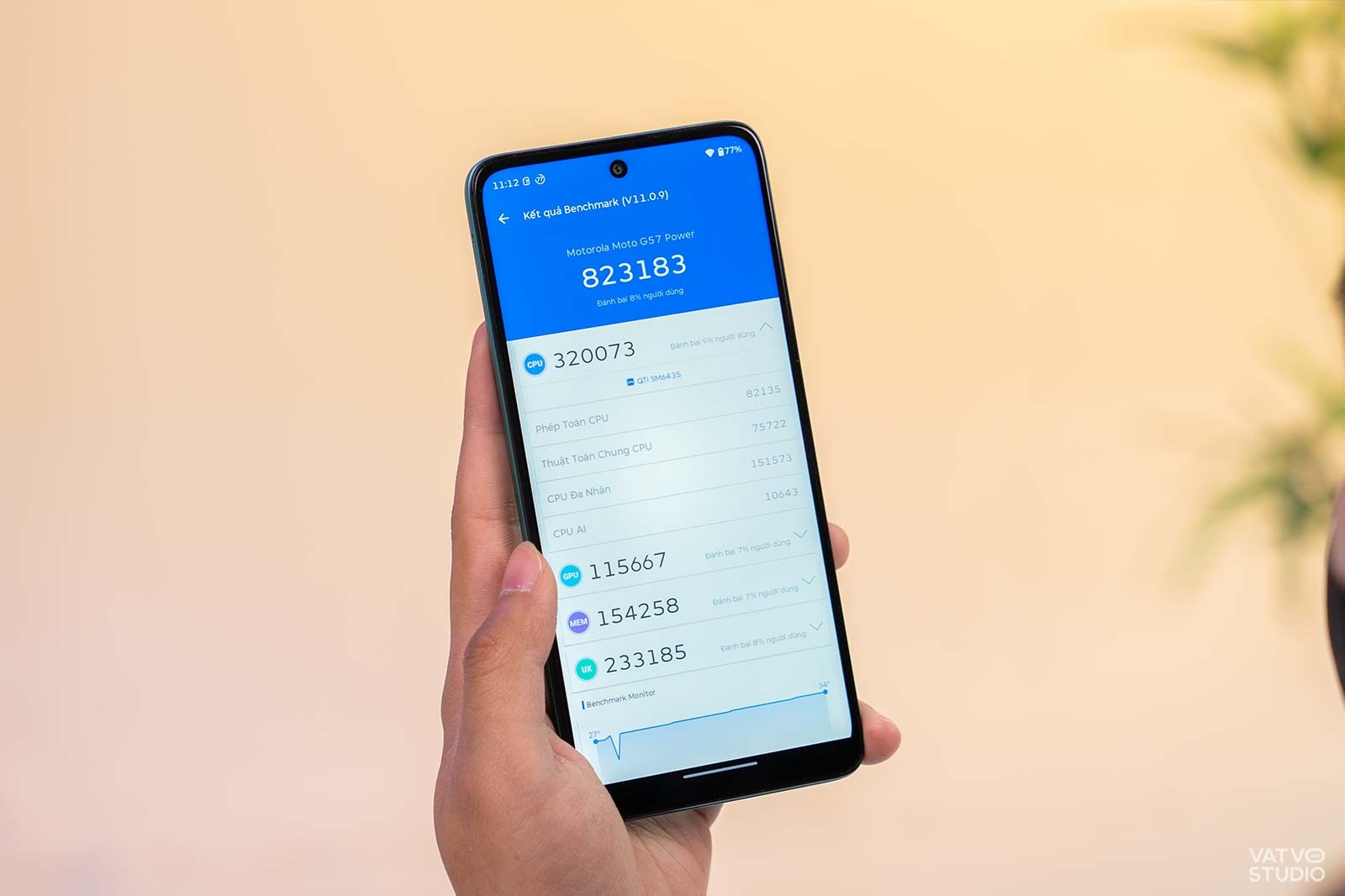 Qua các bài kiểm tra hiệu năng trên phần mềm AnTuTu, máy đạt được điểm số hơn 800.000 điểm. Với các nhu cầu hằng ngày từ lướt mạng xã hội, xem video độ phân giải cao đến chơi các tựa game phổ thông ở mức thiết lập đồ họa trung bình, moto g57 power 5g đều được máy đáp ứng ổn định. Điểm cộng là máy còn được cài sẵn hệ điều hành Android 16 với giao diện Hello UI rất nhẹ nhàng, khá giống với các thiết bị Google Pixel nhưng có nhiều tùy biến hơn.