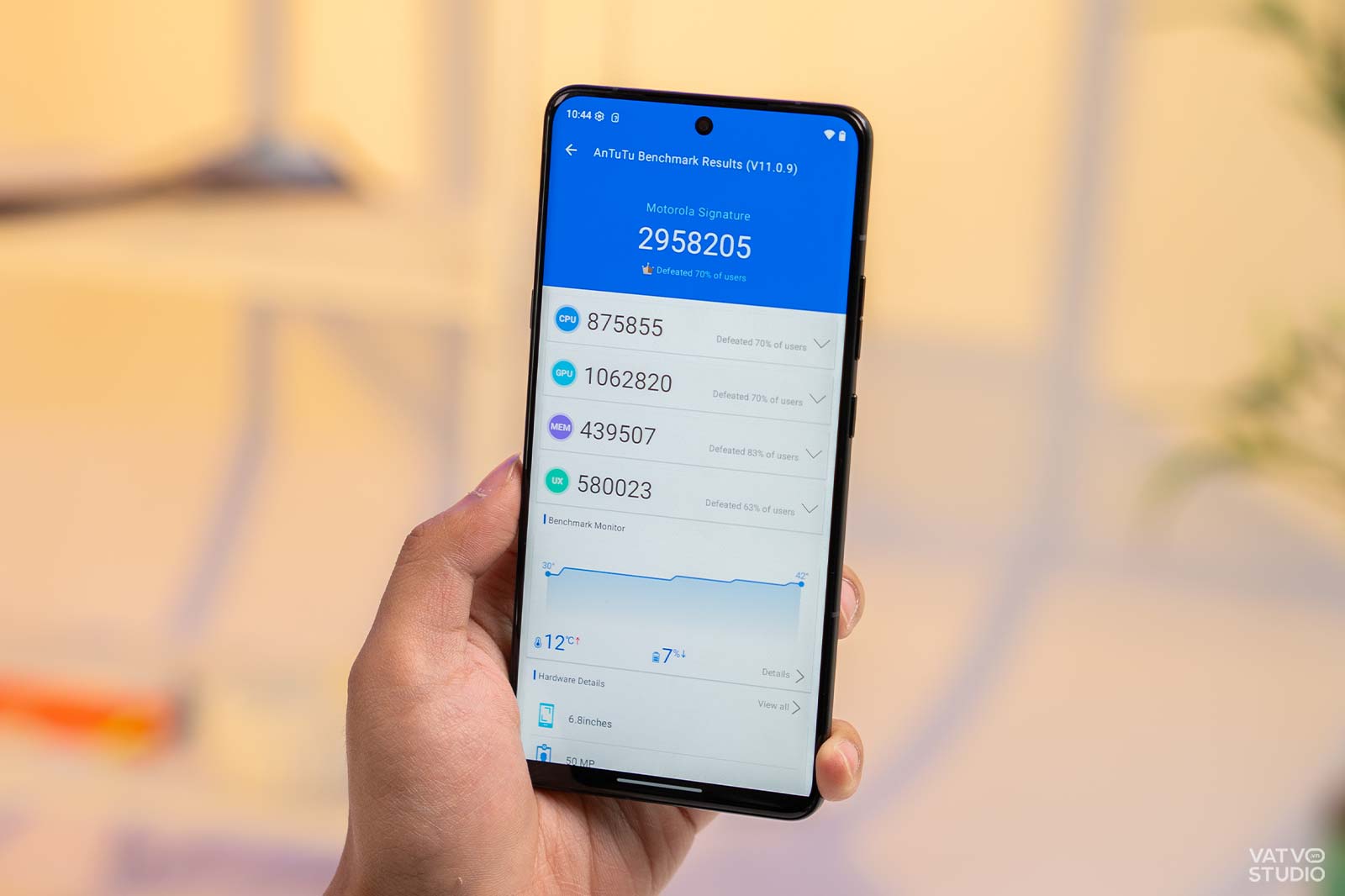 Về hiệu năng, Motorola Signature được trang bị vi xử lý Qualcomm Snapdragon 8 Gen 5. Mặc dù không phải là phiên bản cao cấp nhất, con chip này vẫn cung cấp một mức hiệu năng dồi dào. Với hơn 2 triệu điểm AnTuTu Benchmark, thiết bị hoàn toàn có thể xử lý mượt mà các tựa game nặng như Wuthering Waves hay Genshin Impact. Hệ thống tản nhiệt buồng hơi bên trong chiếc Motorola Signature cũng hoạt động hiệu quả, giúp máy duy trì nhiệt độ ổn định, chỉ hơi ấm nhẹ sau một thời gian dài sử dụng.