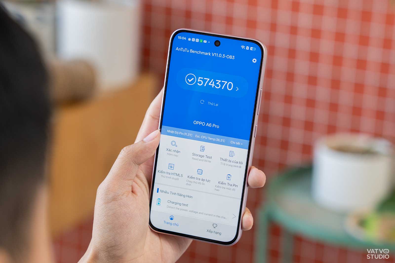 Tuy nhiên, bên cạnh những điểm mạnh kể trên, hiệu năng lại là khía cạnh gây phân vân nhất. Máy được trang bị vi xử lý MediaTek Helio G100, đạt khoảng 574.000 điểm AnTuTu. Với các tác vụ hàng ngày, máy phản hồi tương đối ổn định nhờ sự tối ưu tốt của giao diện ColorOS 15.