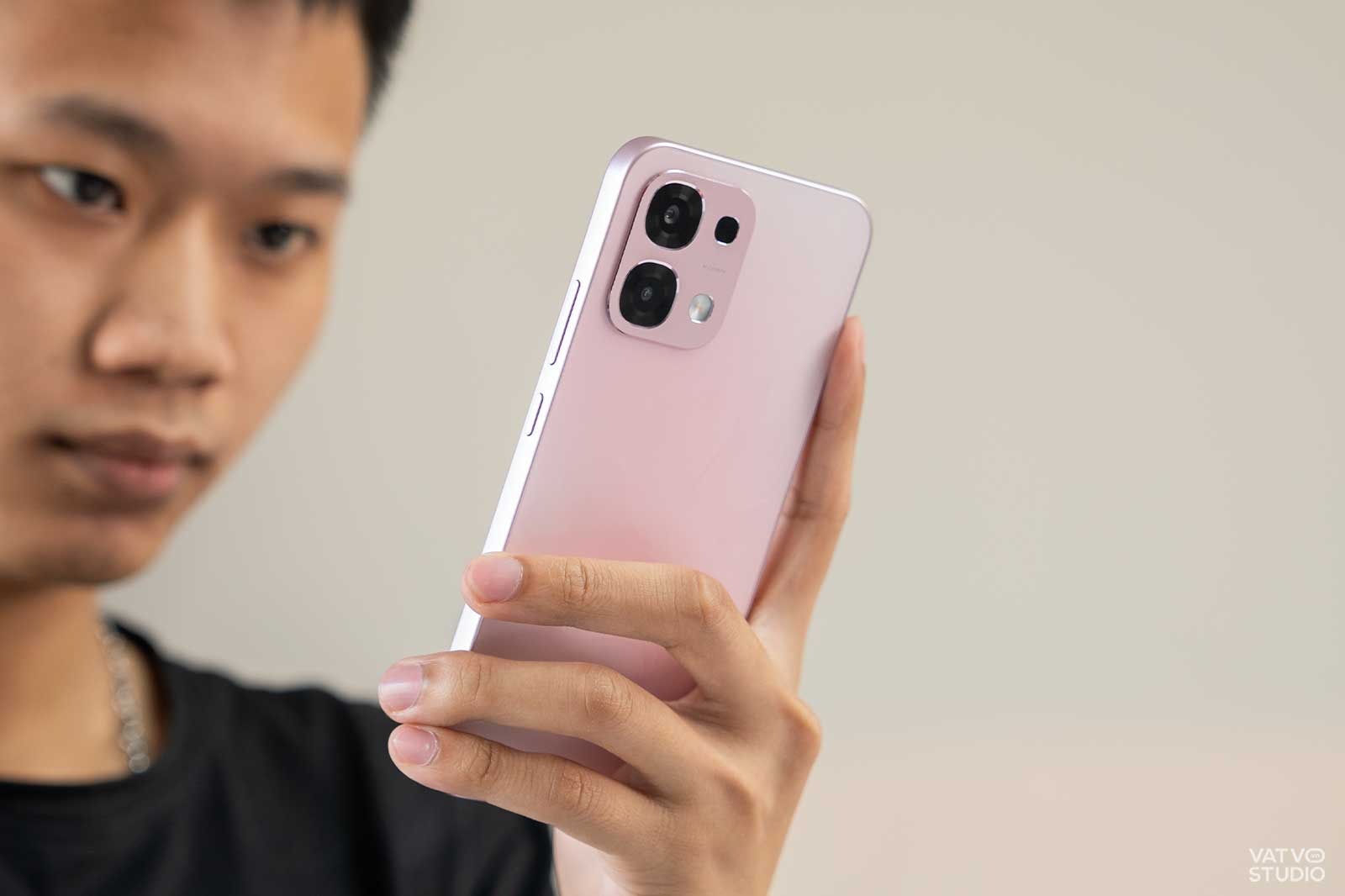 Mặt lưng được làm từ chất liệu nhựa hoàn thiện dạng nhám, giúp hạn chế hiệu quả tình trạng bám bụi bẩn và dấu vân tay. Phiên bản mình đang sử dụng là màu Hồng có họa tiết rất đẹp, nhìn không khác gì dòng Reno của OPPO.