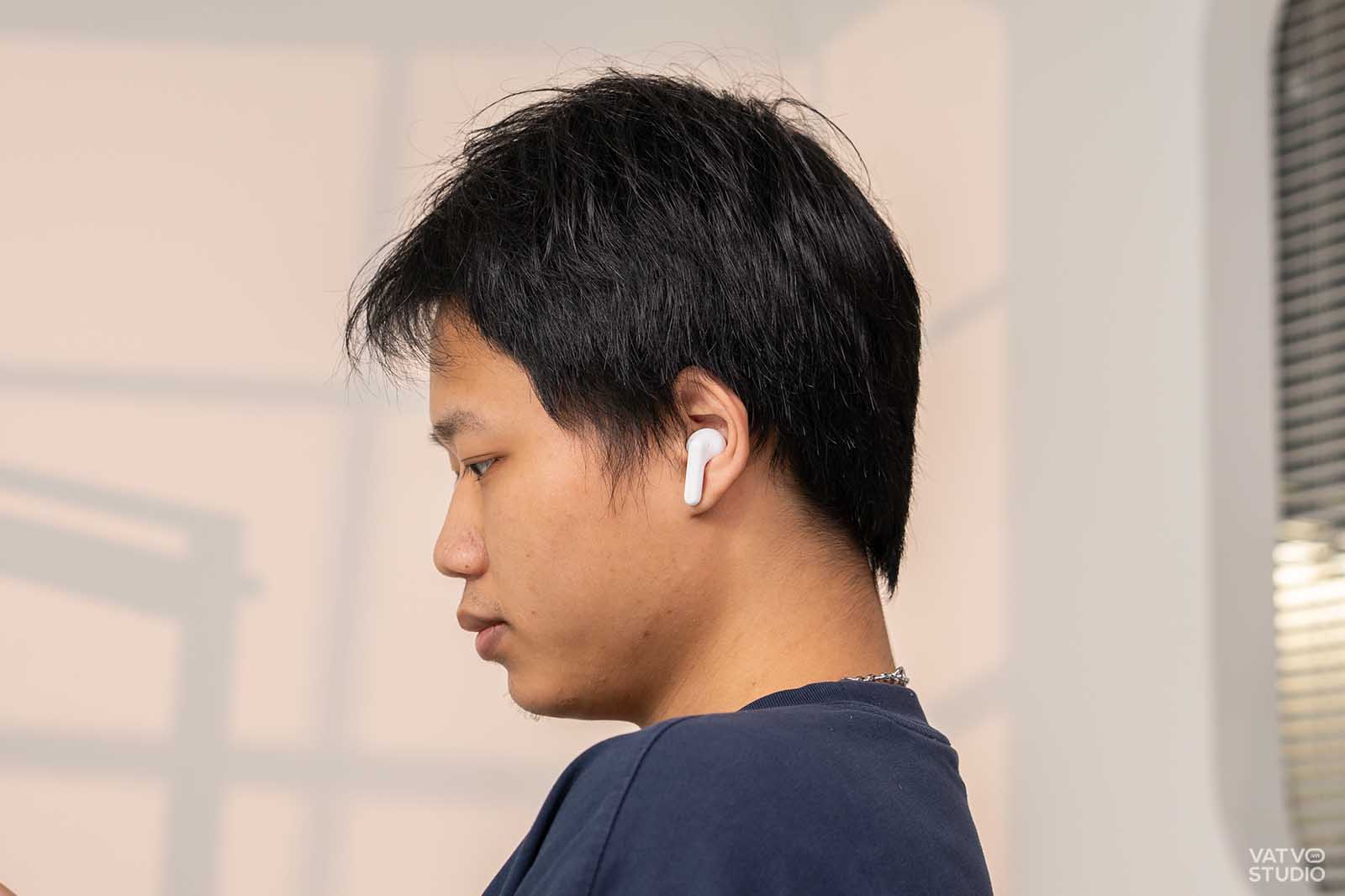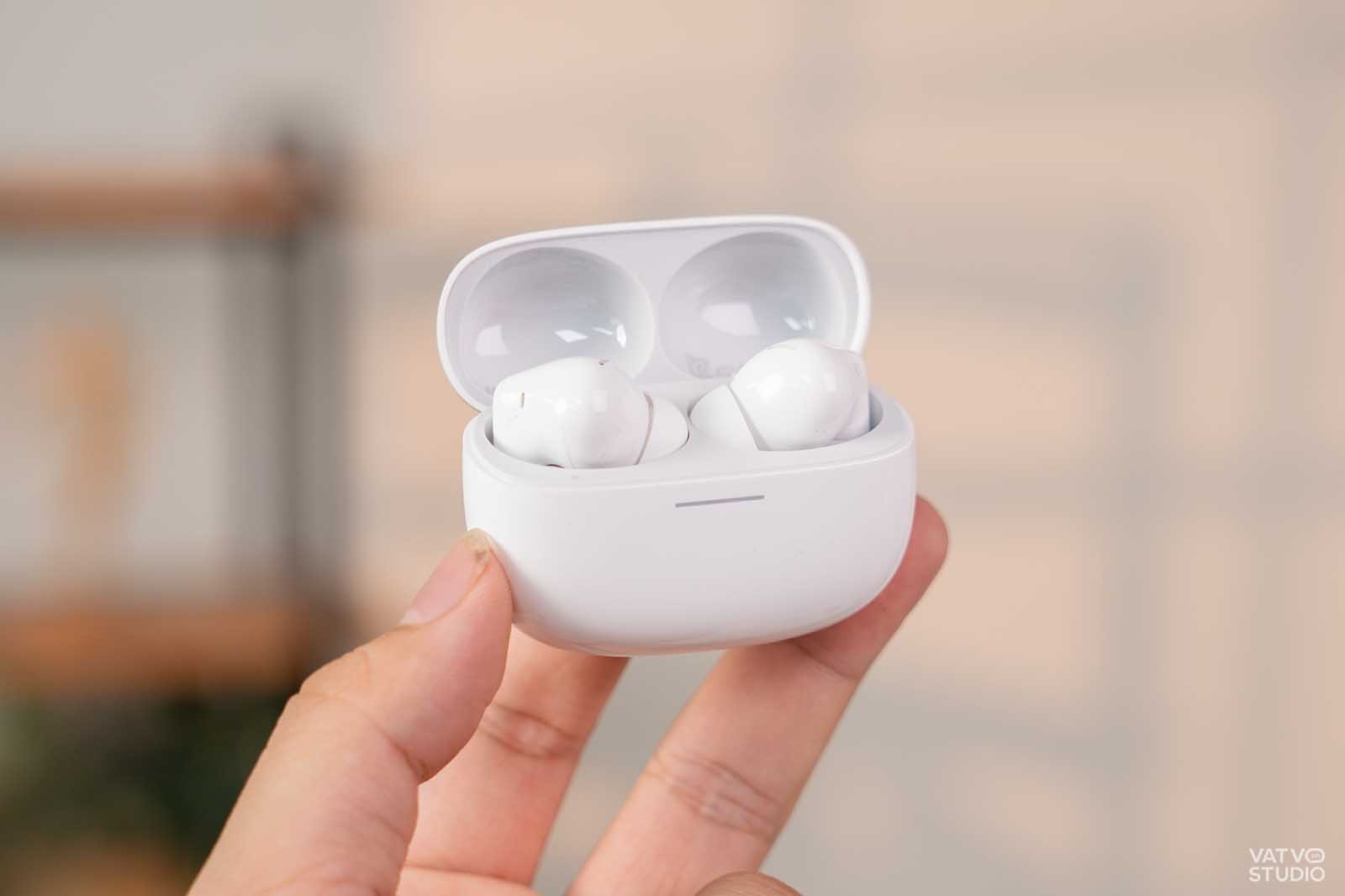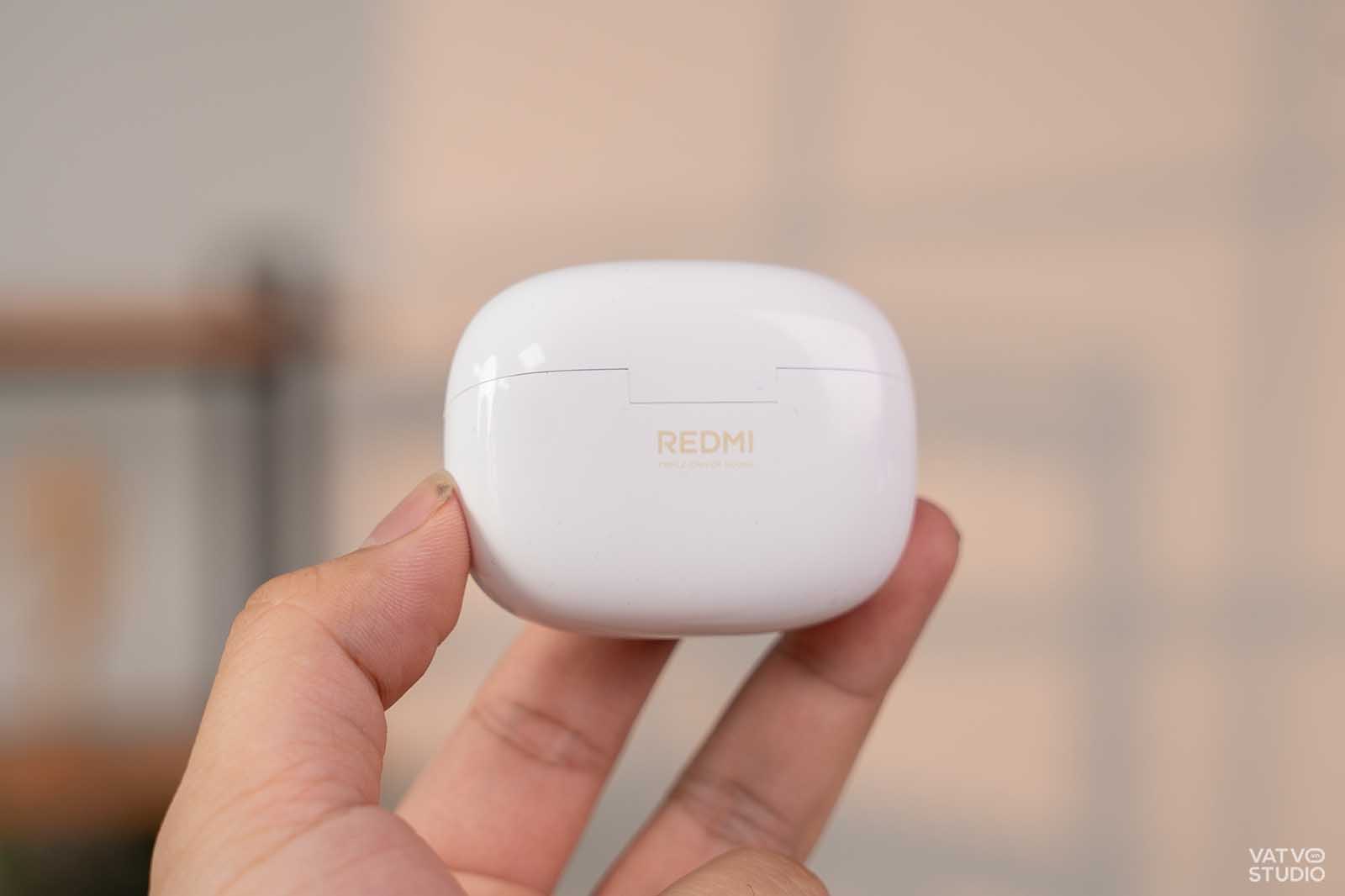 Điểm khác biệt so với thế hệ tiền nhiệm là logo REDMI năm nay được in hoa toàn bộ, mang lại cảm giác chuyên nghiệp và mạnh mẽ hơn. Về khối lượng, mỗi bên tai nghe chỉ nặng 5,3 gram và tổng khối lượng cả hộp sạc là 49 gram. Khi mình đeo thử, thiết bị cho cảm giác rất nhẹ nhàng và không gây áp lực lên vành tai. Ngoài ra, việc hỗ trợ chuẩn kháng bụi và nước IP54 cũng giúp mình yên tâm hơn khi sử dụng lúc tập thể thao hoặc đi dưới mưa nhỏ