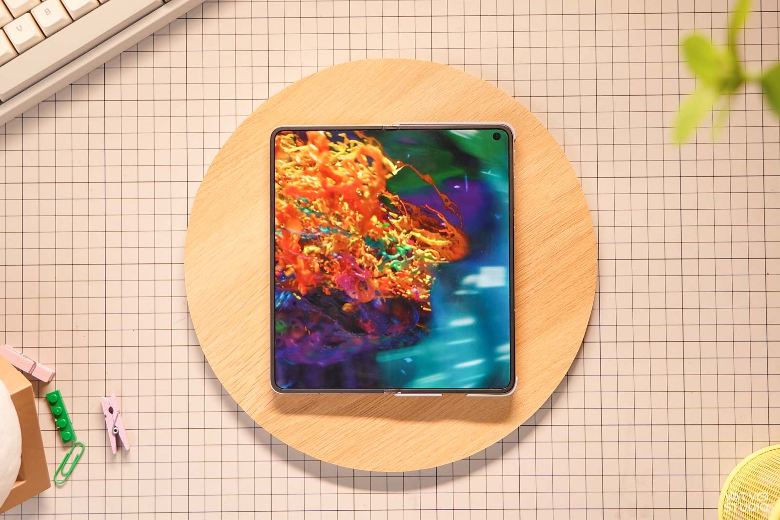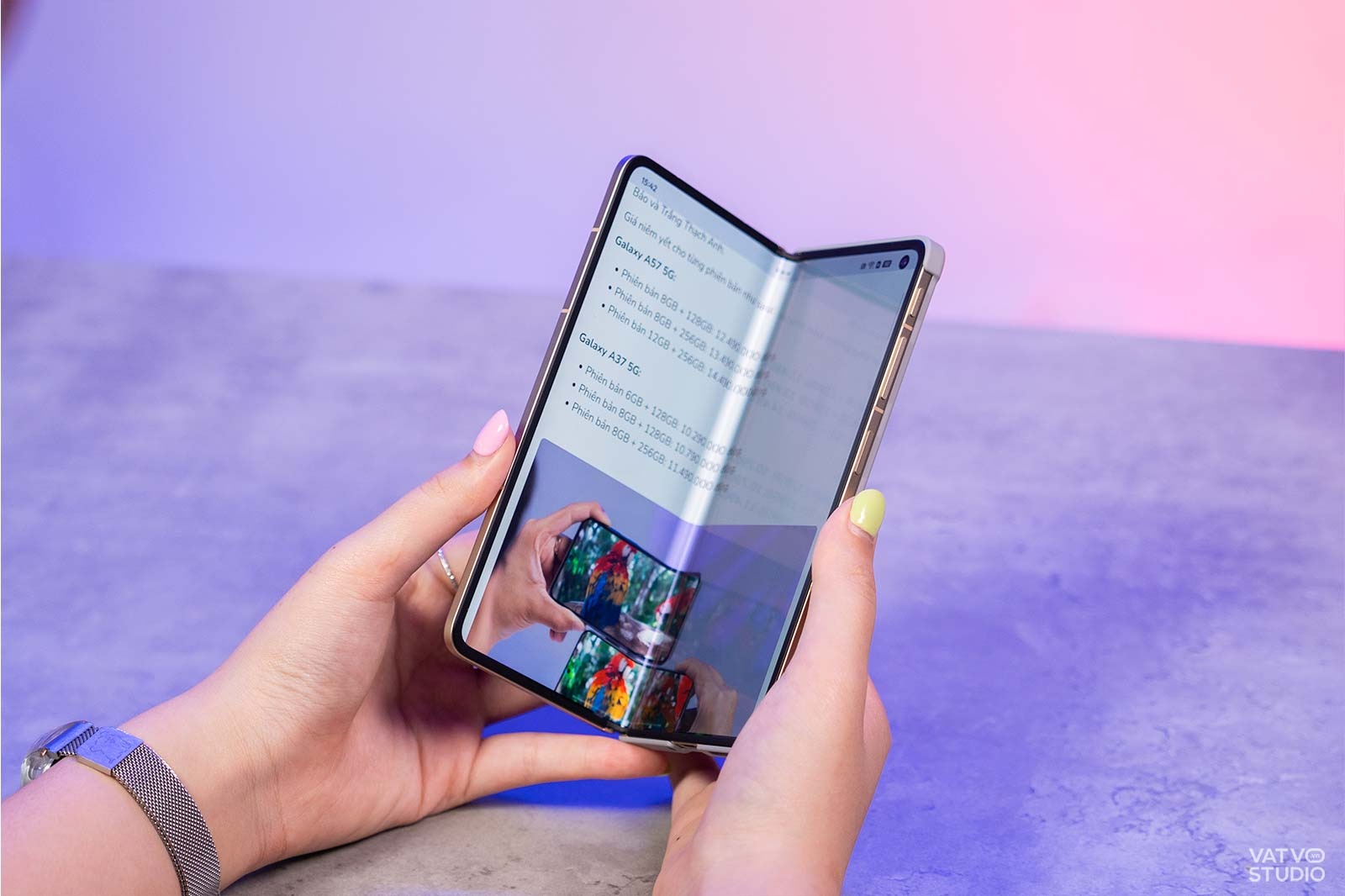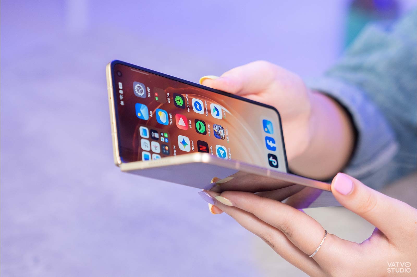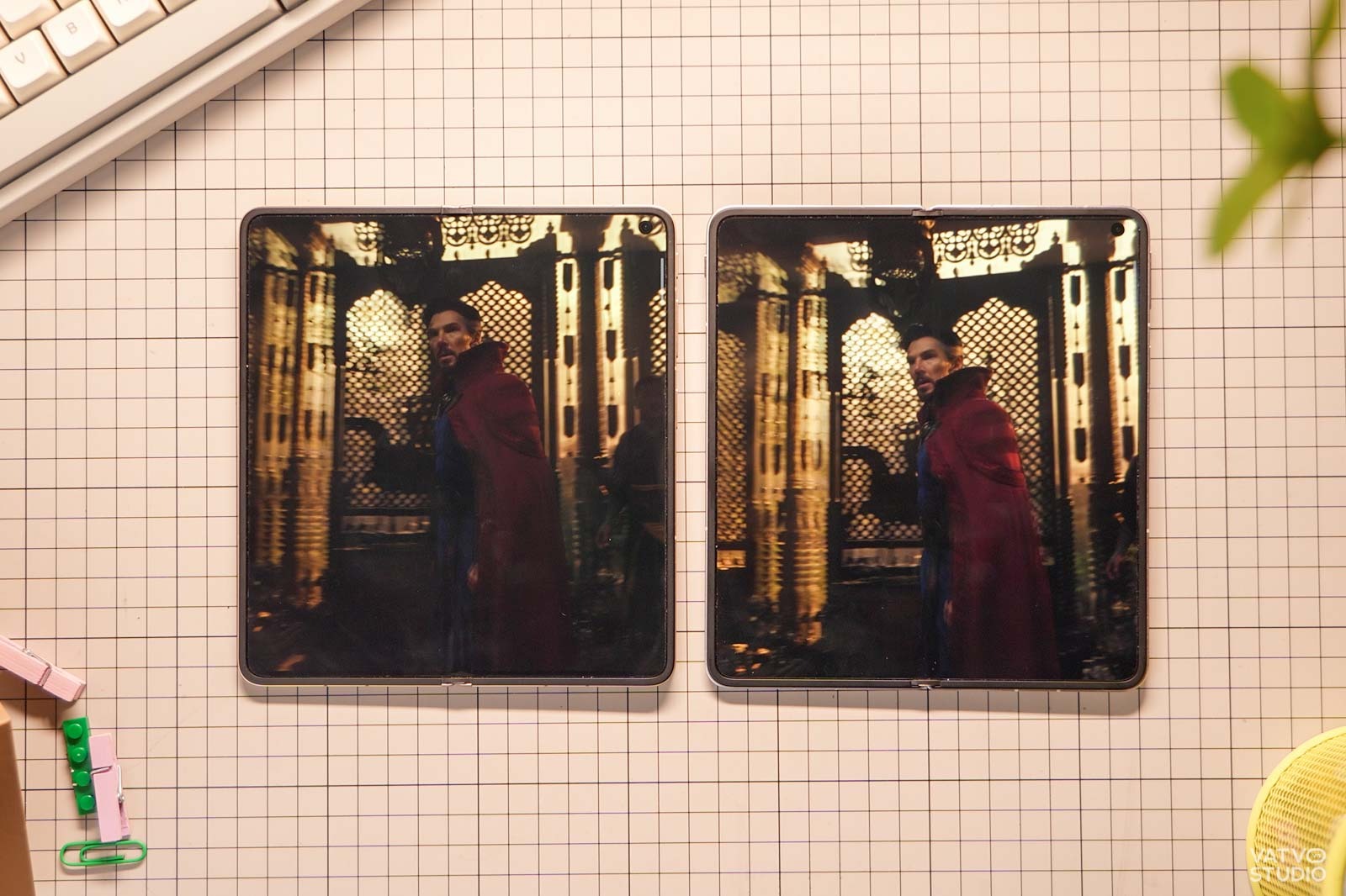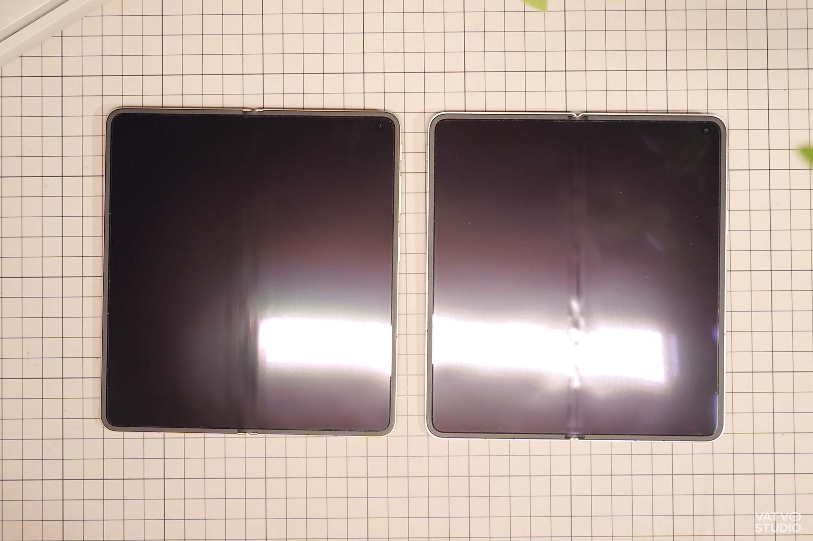Trong thử nghiệm dưới đây, mình có thử dùng một chiếc đèn LED studio, chiếu thẳng vào màn hình của OPPO Find N6 và Find N5 khi gập ngửa. Dễ thấy, trên Find N5, vết hằn xuất hiện khá rõ và chi tiết, tuy nhiên, với Find N6, vết hằn chỉ xuất hiện vô cùng mờ, dễ bị bỏ qua nếu không nhìn kỹ.