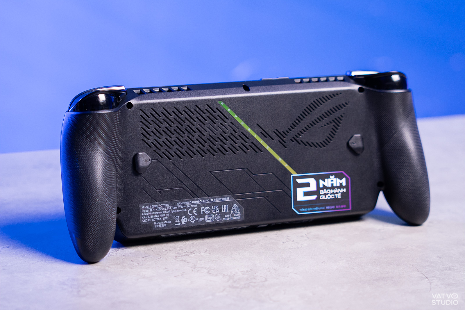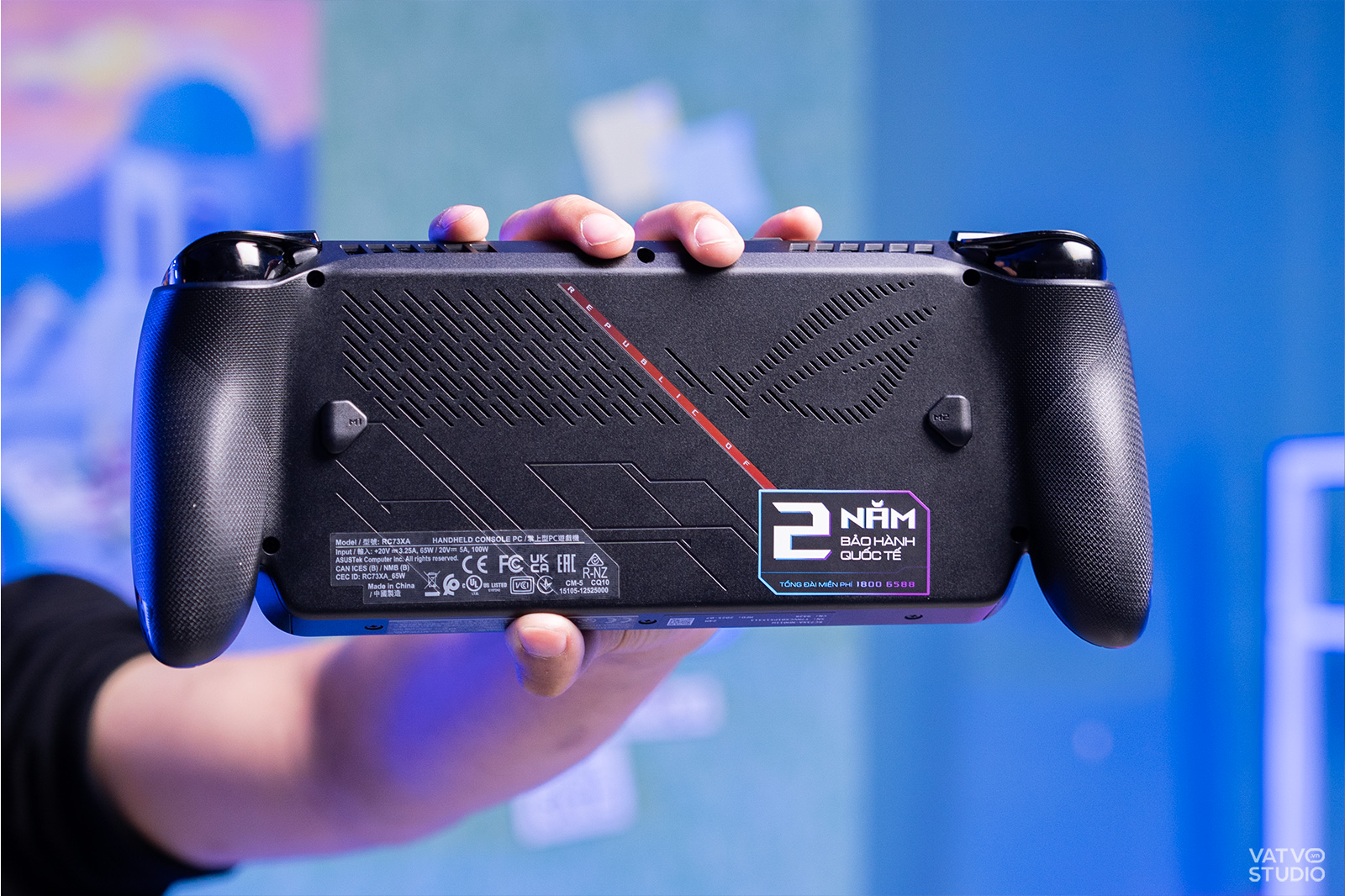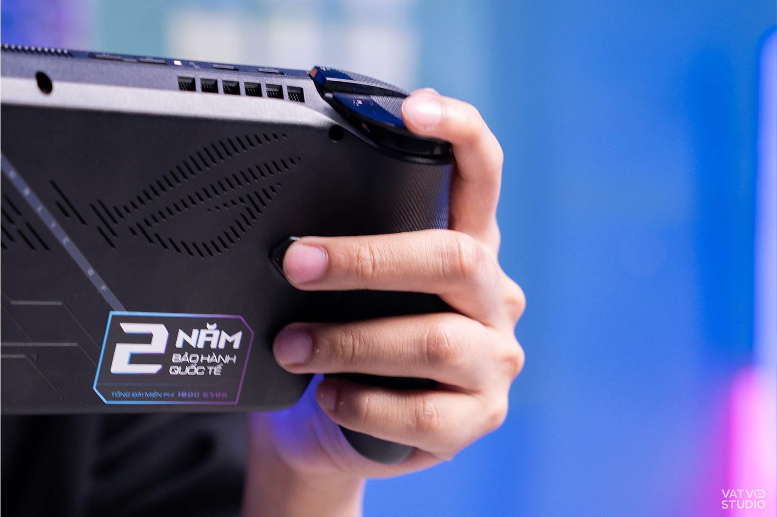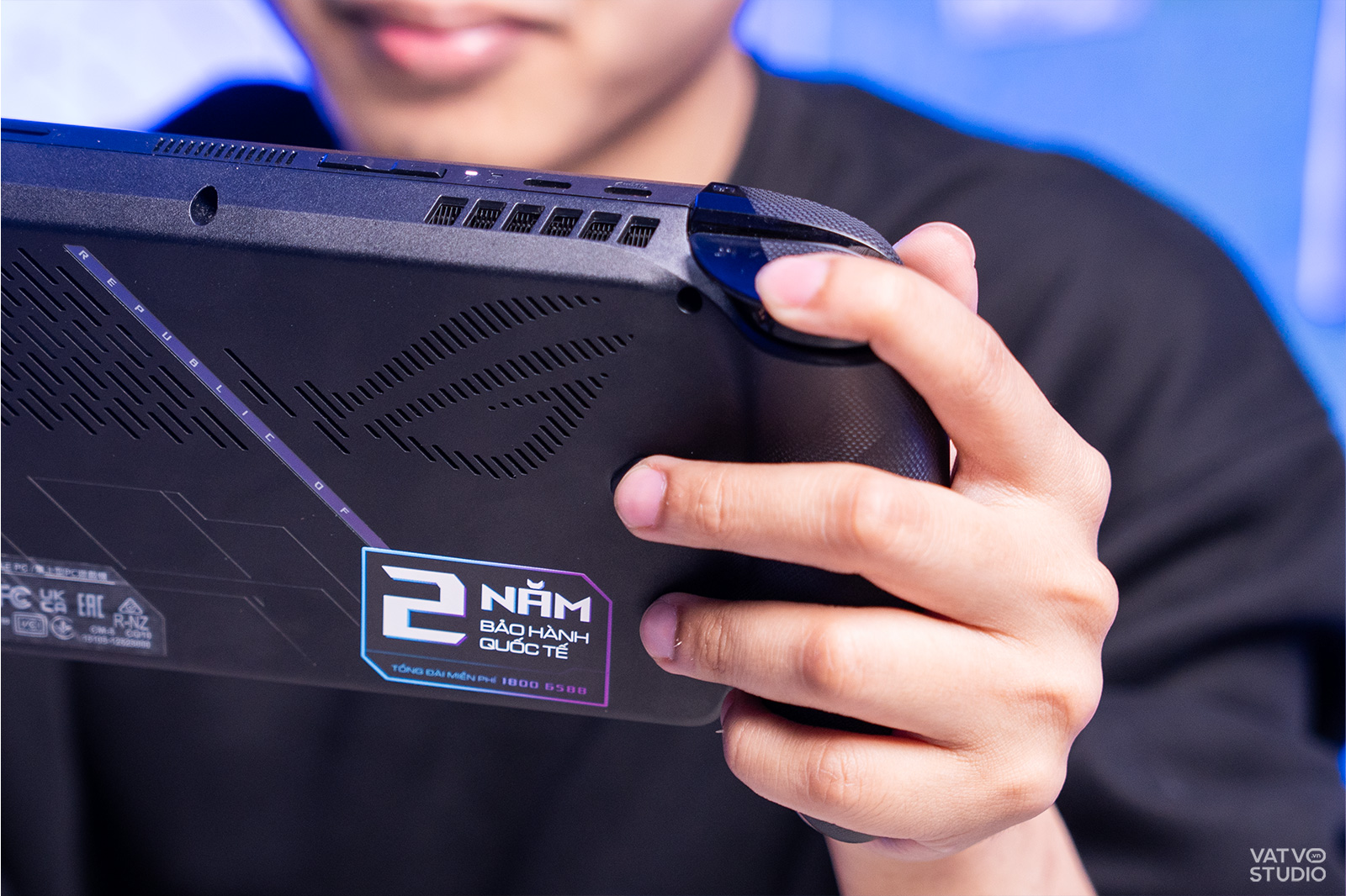 Báng cầm (Grip) trên ROG Xbox Ally X mang đến những sự cải tiến tích cực về cảm giác cầm nắm. Grip trước được làm phình lên một chút, hơi nhám để tránh tình trạng bị mỏi khi sử dụng lâu. Trong khi đó, grip sau còn có các đường họa tiết chấm bi (thực ra được dập các con chữ ROG cách điệu) tạo ra độ ma sát lớn, cảm giác cầm nắm thoái mái, chống trượt tay.
