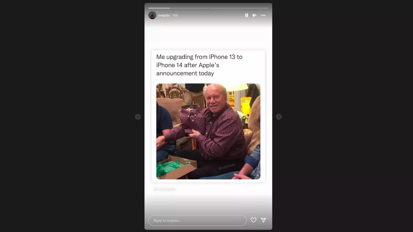 Theo đó, bài đăng với tiêu đề: “Me upgrading from iPhone 13 to iPhone 14 after Apple’s announcement today” – tạm dịch: “Tôi sau khi nâng đời từ iPhone 13 lên iPhone 14 sau sự kiện của Apple hôm qua”. Phía dưới tiêu đề là một bức ảnh chế (meme) mô tả người đàn ông đang cầm trên tay một chiếc sơ mi giống hết chiếc anh ta đang mặc.