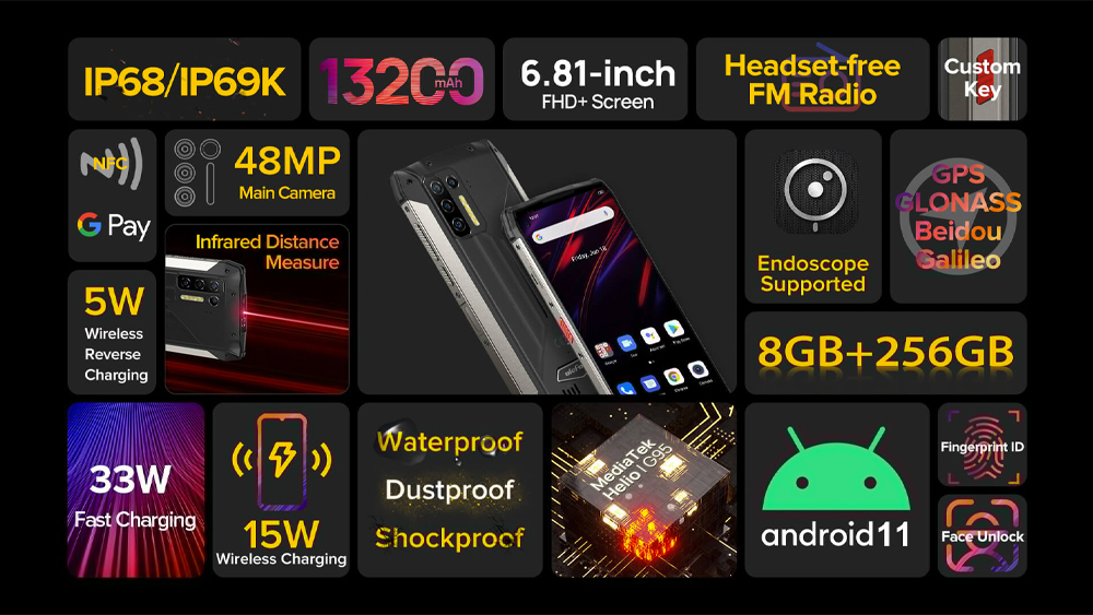 “Power Armor 13” là sản phẩm mới nhất của thương hiệu đến từ Trung Quốc – Ulefone. Đây là một thương hiệu khá “vô danh” trên thị trường quốc tế, do đó thứ đáng quan tâm nhất của máy là ở dung lượng pin 13.200mAh. Dung lượng pin này có thể giúp cho người dùng có thể sử dụng máy trong 5, thời gian chờ 600 giờ và thời gian đàm thoại 17 giờ. Máy hỗ trợ sạc nhanh 33W, sạc không dây 15W và sạc ngược không dây cho các thiết bị khác với công suất 5W để tận dụng tối đa dung luọng pin của nó.