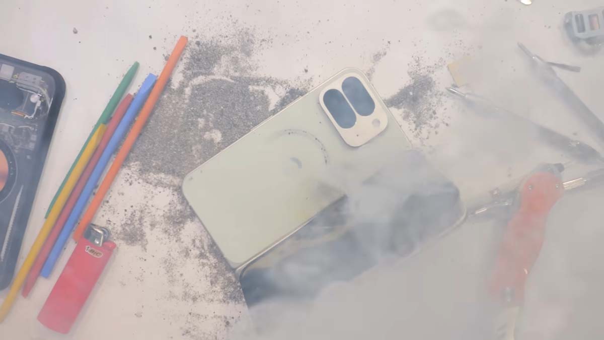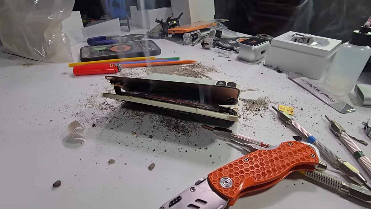 Khi Nelson tiếp tục tác động lực vào phần máy đã gãy, viên pin bên trong đột ngột phồng lên, quá nhiệt và bốc khói trắng dày đặc, đủ để kích hoạt hệ thống báo cháy trong phòng. Cuối cùng, chiếc điện thoại đắt tiền chỉ còn là một khối cháy đen trên bàn thử nghiệm.