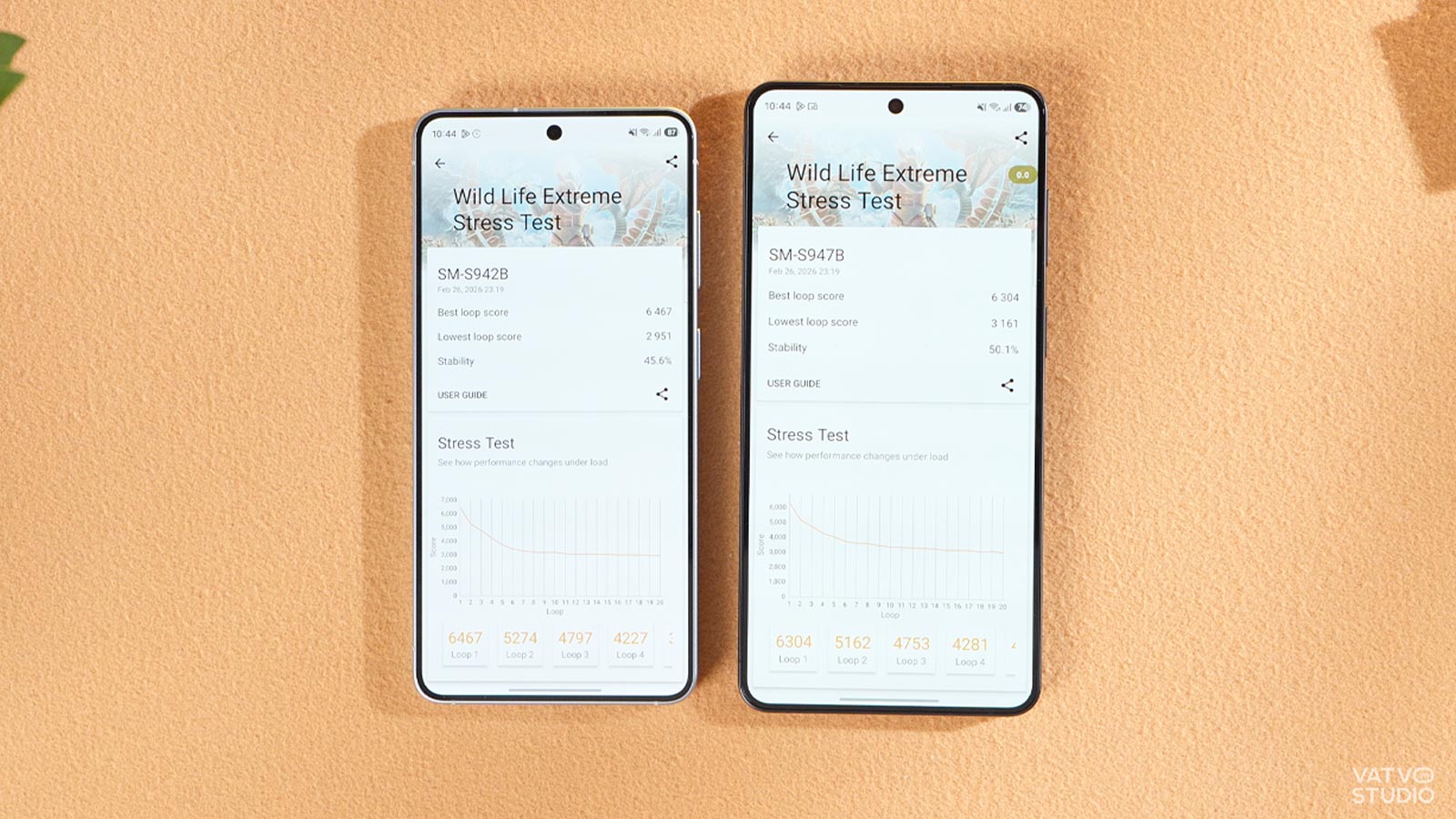 Chuyển sang phần mềm 3DMark với bài kiểm tra Wild Life Extreme Stress Test, điểm số của hai thiết bị khá tương đồng. Vòng lặp cao nhất đạt khoảng hơn 6.000 điểm, trong khi vòng lặp thấp nhất rơi vào khoảng 3.000 điểm. Độ ổn định của thiết bị đạt mức 50%. Dù con số 50% nghe có vẻ không cao, nhưng với một vi xử lý cao cấp, đây là hiện tượng bình thường. Các hãng sản xuất thường đẩy hiệu năng lên mức tối đa ở những vòng đầu tiên và sau đó chủ động giảm công suất, nhằm mục đích bảo vệ các linh kiện bên trong và kiểm soát nhiệt độ tổng thể.