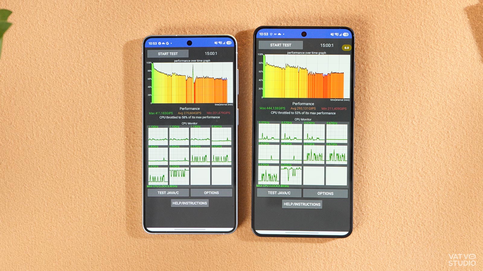 Tiếp tục với phần mềm CPU Throttling Test, bài kiểm tra này đánh giá hiệu năng duy trì CPU trong 15 phút. Biểu đồ cho thấy cả Galaxy S26 và Galaxy S26+ chỉ duy trì được sức mạnh tối đa trong chưa đầy một phút đầu tiên. Ngay từ phút thứ hai trở đi, hiệu năng của máy đã bị giảm xung nhịp xuống chỉ còn khoảng 60% đến 80%.