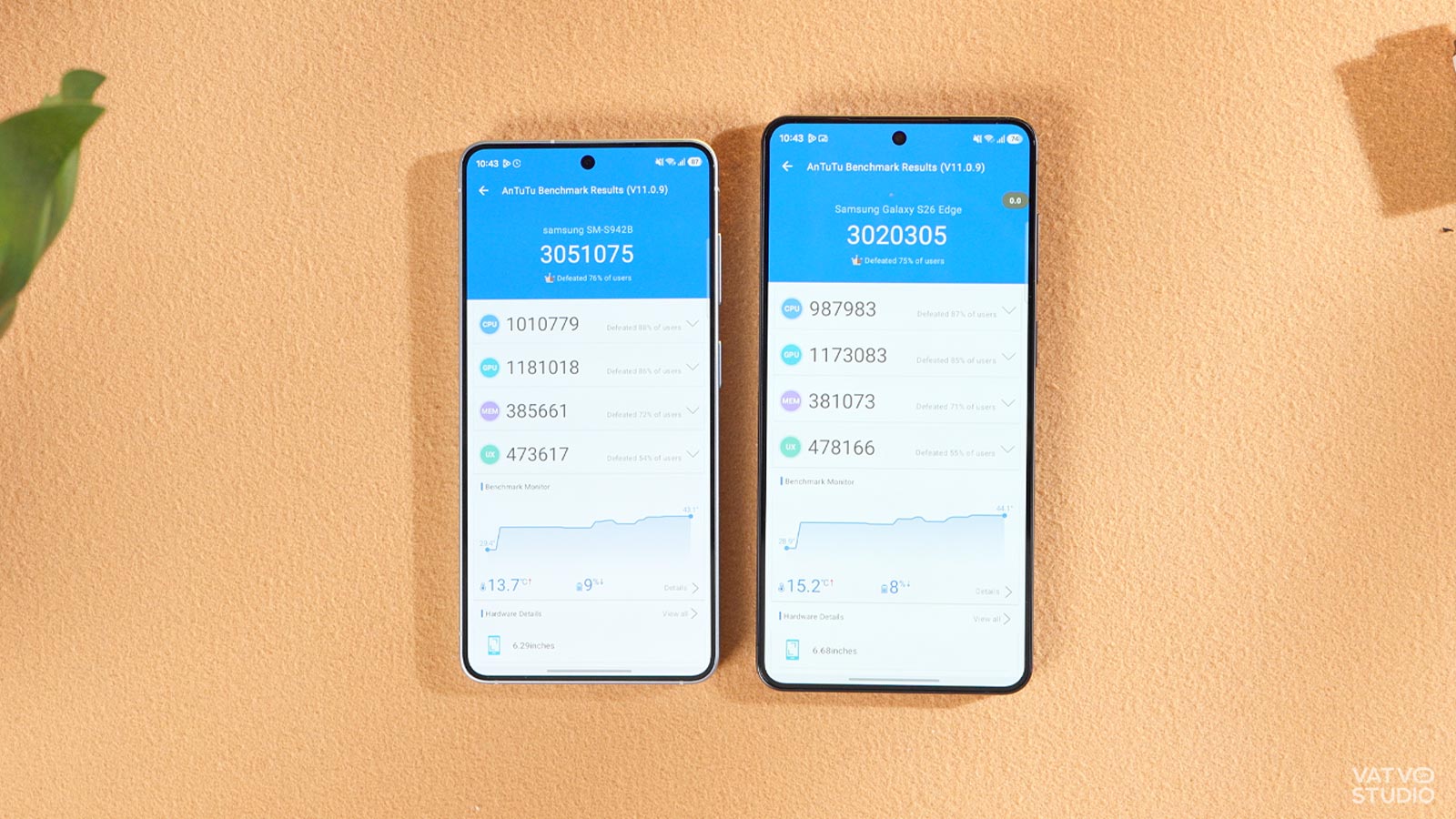 Quá trình chấm điểm AnTuTu Benchmark cũng bộc lộ một vài vấn đề nhỏ về khả năng kiểm soát nhiệt. Sau bài kiểm tra kéo dài khoảng 15 phút, nhiệt độ của thiết bị tăng lên khá cao. Cụ thể, mẫu Galaxy S26+ ghi nhận mức tăng lên đến 15 độ C. Tương tự, phiên bản tiêu chuẩn Galaxy S26 cũng tăng thêm 14 độ C. Điều này cho thấy hệ thống tản nhiệt và vi xử lý vẫn sinh ra một lượng nhiệt lớn khi phải hoạt động ở mức công suất tối đa.