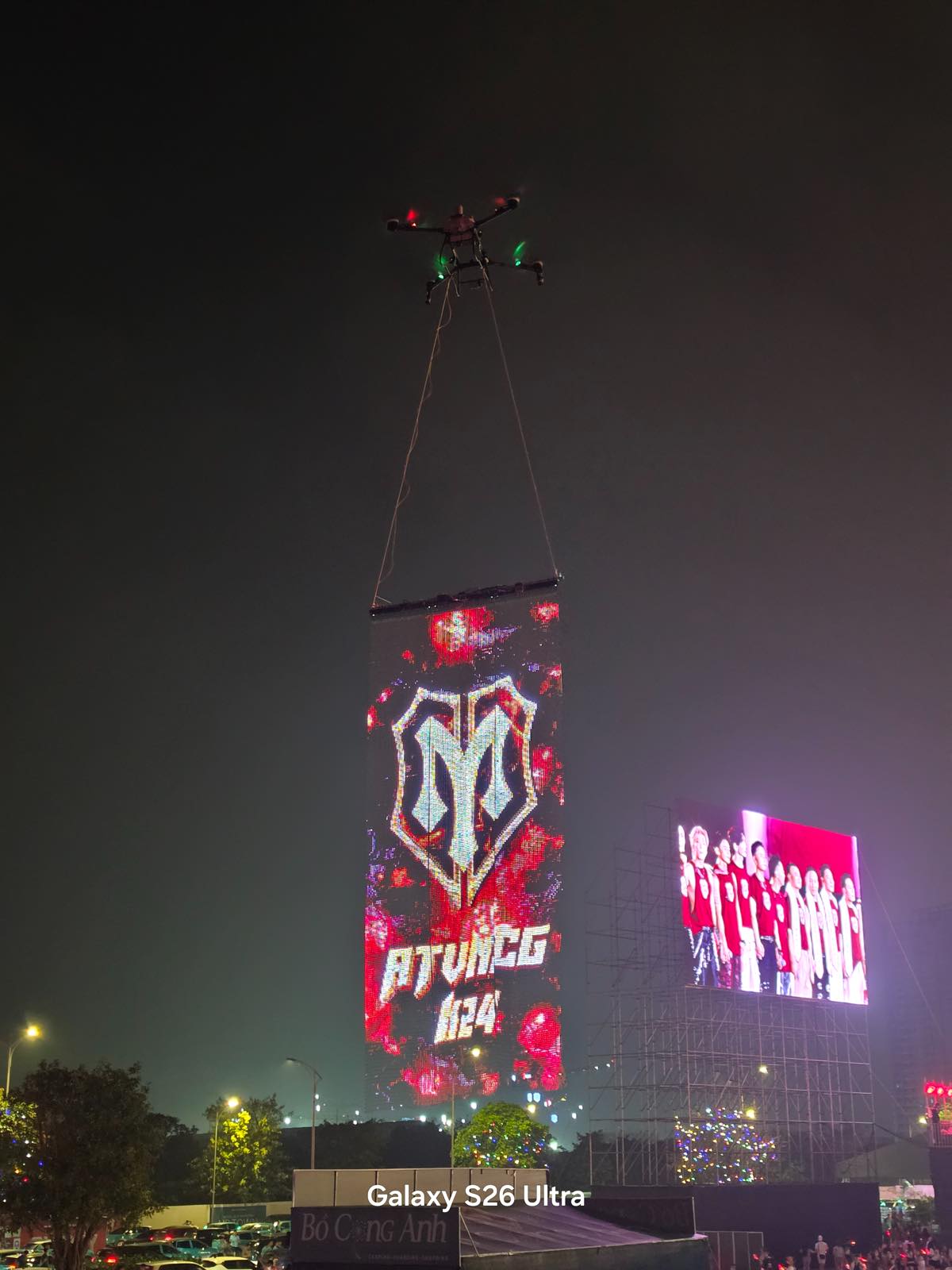Một khoảnh khắc vô cùng độc đáo trong đêm nhạc là khi hai chiếc drone bay trên sân khấu, trình chiếu dải LED mang tên chương trình. Mình đã nhanh chóng sử dụng Galaxy S26 Ultra để chụp lại khung cảnh này. Ở cả hai mức zoom 2X và 5X, hình ảnh hiện lên sắc nét, tốc độ màn trập được xử lý nhanh giúp ảnh không bị nhòe, từ đó ghi dấu một kỷ niệm độc nhất vô nhị của buổi lễ “tốt nghiệp” năm nay.