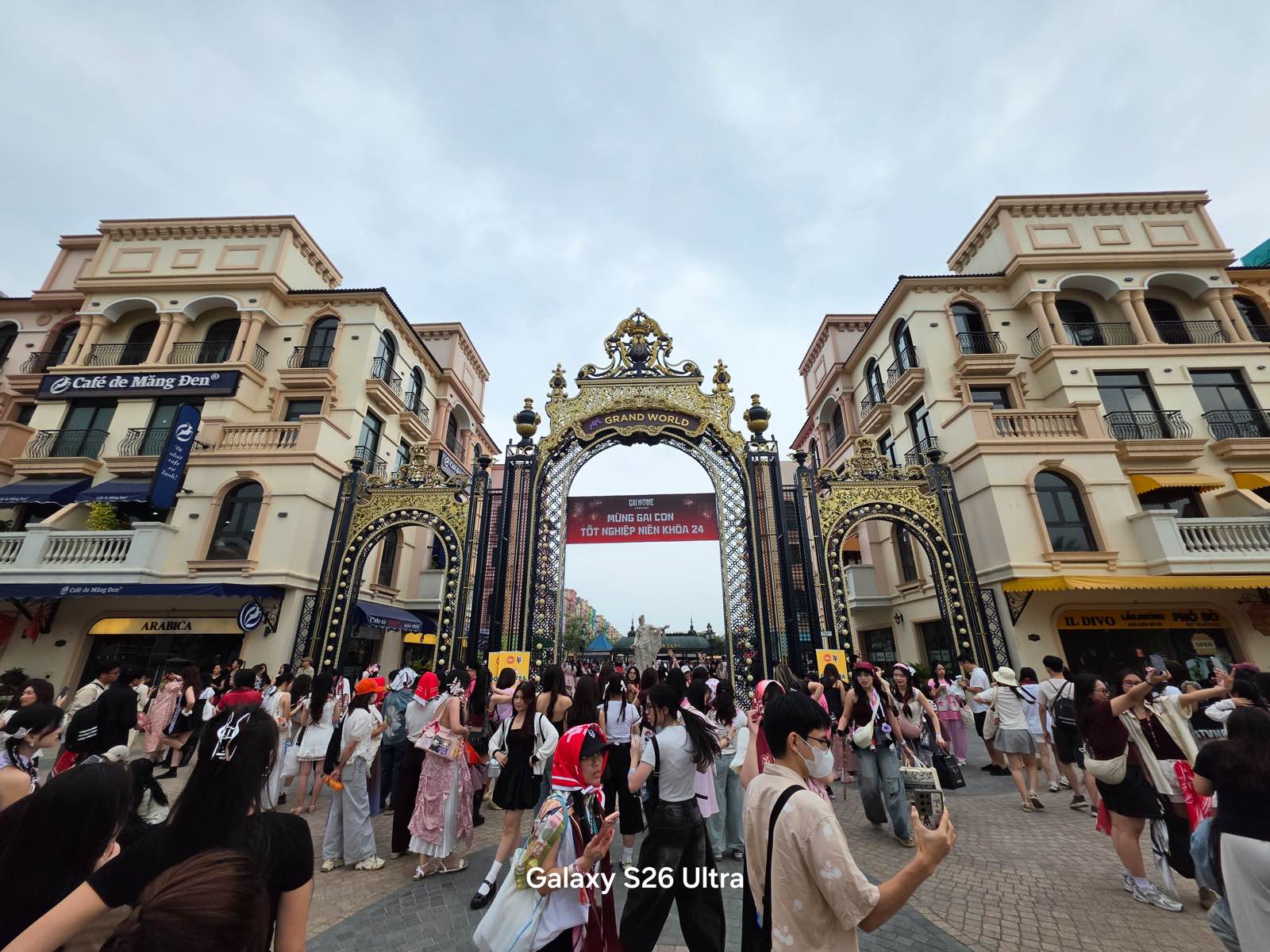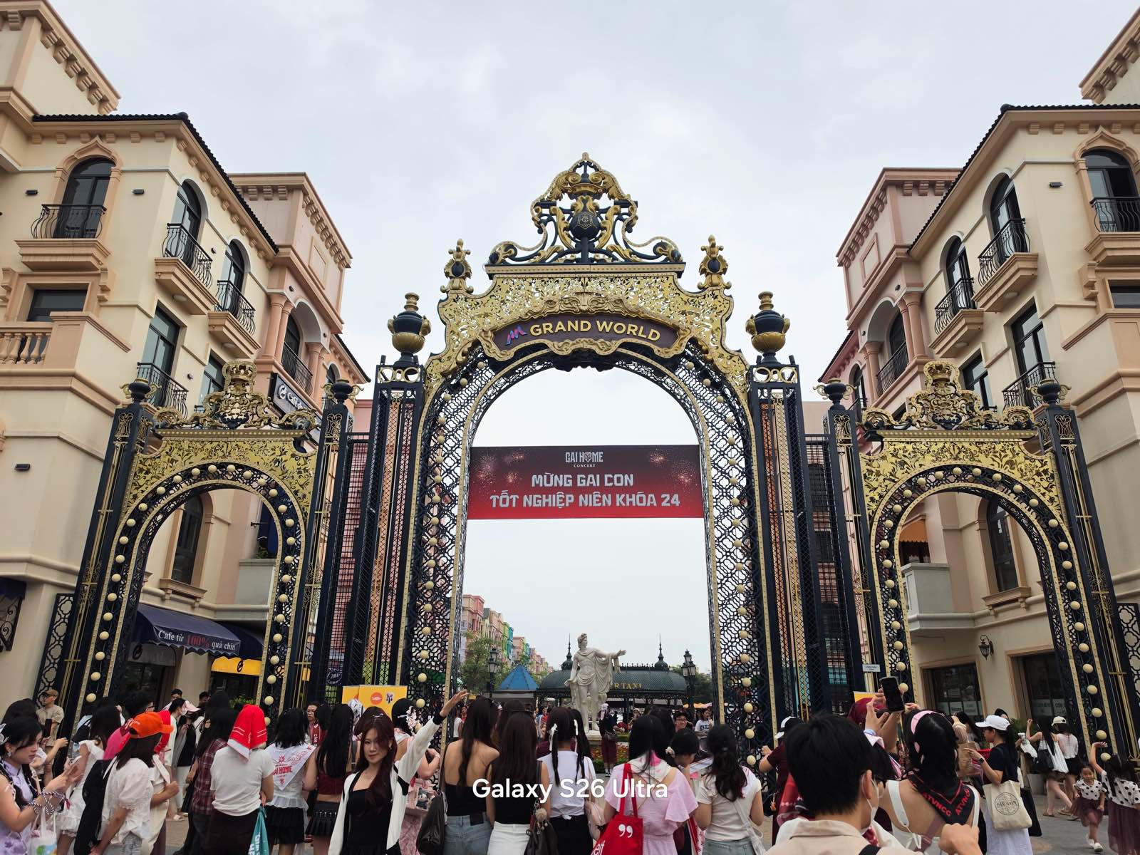 Mình tới địa điểm tổ chức concert vào buổi trưa và bắt đầu trải nghiệm Galaxy S26 Ultra với các hoạt động xoay quanh concert. Vừa đặt chân đến cổng chào của Mega Grand World, mình đã bị ấn tượng bởi băng rôn “Mừng Gai Con tốt nghiệp niên khóa 24”. Mình sử dụng cả camera góc siêu rộng và camera chính để ghi lại khoảnh khắc này. Hình ảnh cho ra có chất lượng rất tốt, màu sắc tươi tắn và trung thực.