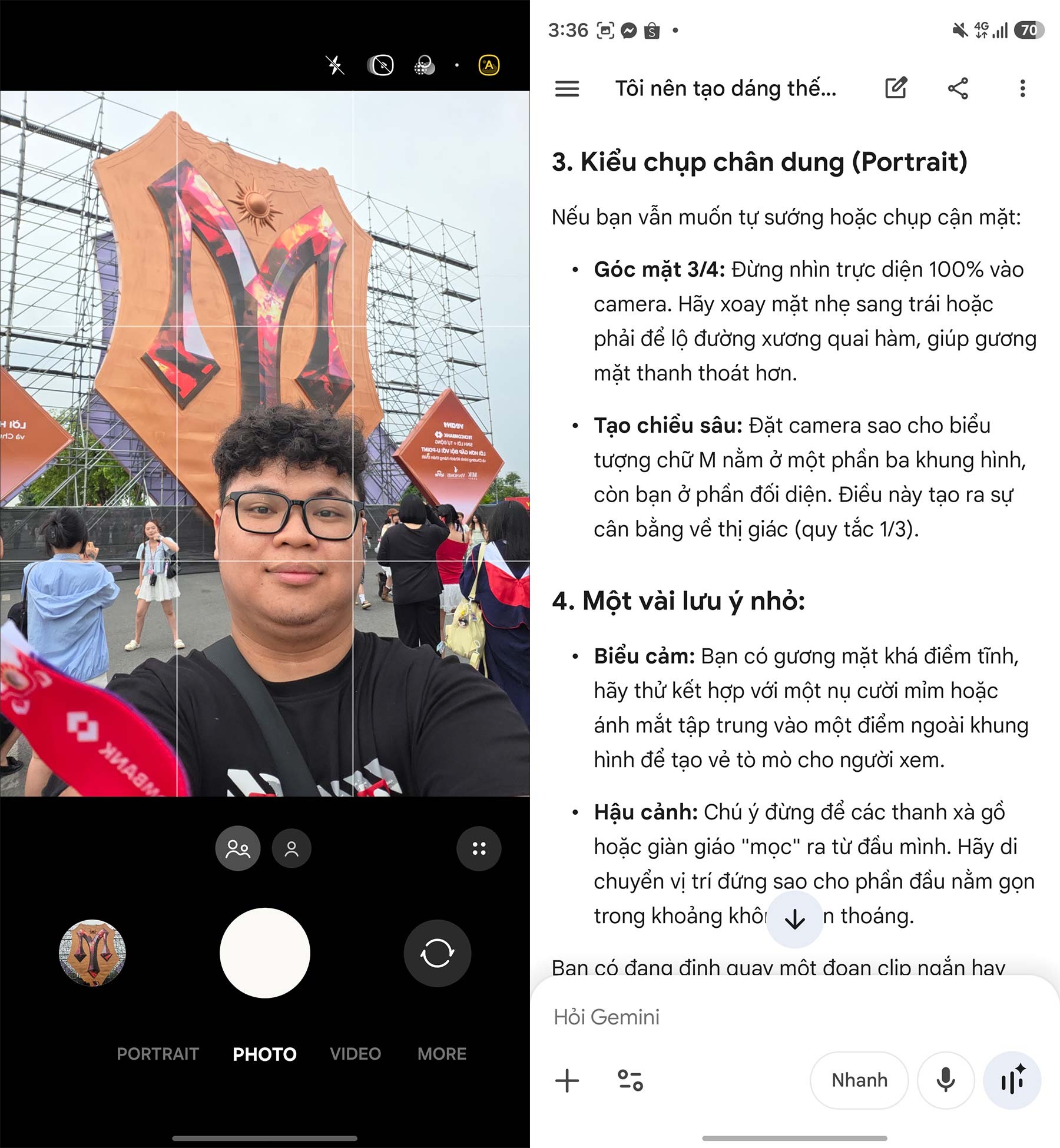 Tại sự kiện đông đúc như concert, Gemini Live còn có thể hỗ trợ mình trong rất nhiều việc khác. Mình có thể bật camera và yêu cầu trợ lý AI tìm đường đến khu vực gửi xe thuận tiện nhất hoặc tìm các quầy dịch vụ tiện ích xung quanh. Khả năng nhận diện hình ảnh và phản hồi bằng giọng nói của Gemini Live thực sự biến chiếc điện thoại thành một người trợ lý hữu dụng, giúp mình tiết kiệm ít nhiều thời gian tại những nơi đông đúc như concert.