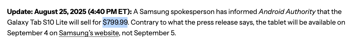 Đáng chú ý, phát ngôn viên của Samsung đã xác nhận với Android Authority rằng, Galaxy Tab S10 Lite sẽ có giá 799,99 USD (khoảng 21 triệu đồng). Bên cạnh đó, máy sẽ chính thức được mở bán từ ngày 4 tháng 9 tới đây trên trang web chính thức của Samsung, thay vì ngày 5 tháng 9 như một số thông tin ban đầu. Sản phẩm sẽ có ba tùy chọn màu sắc là Xám, Bạc và Đỏ San Hô.