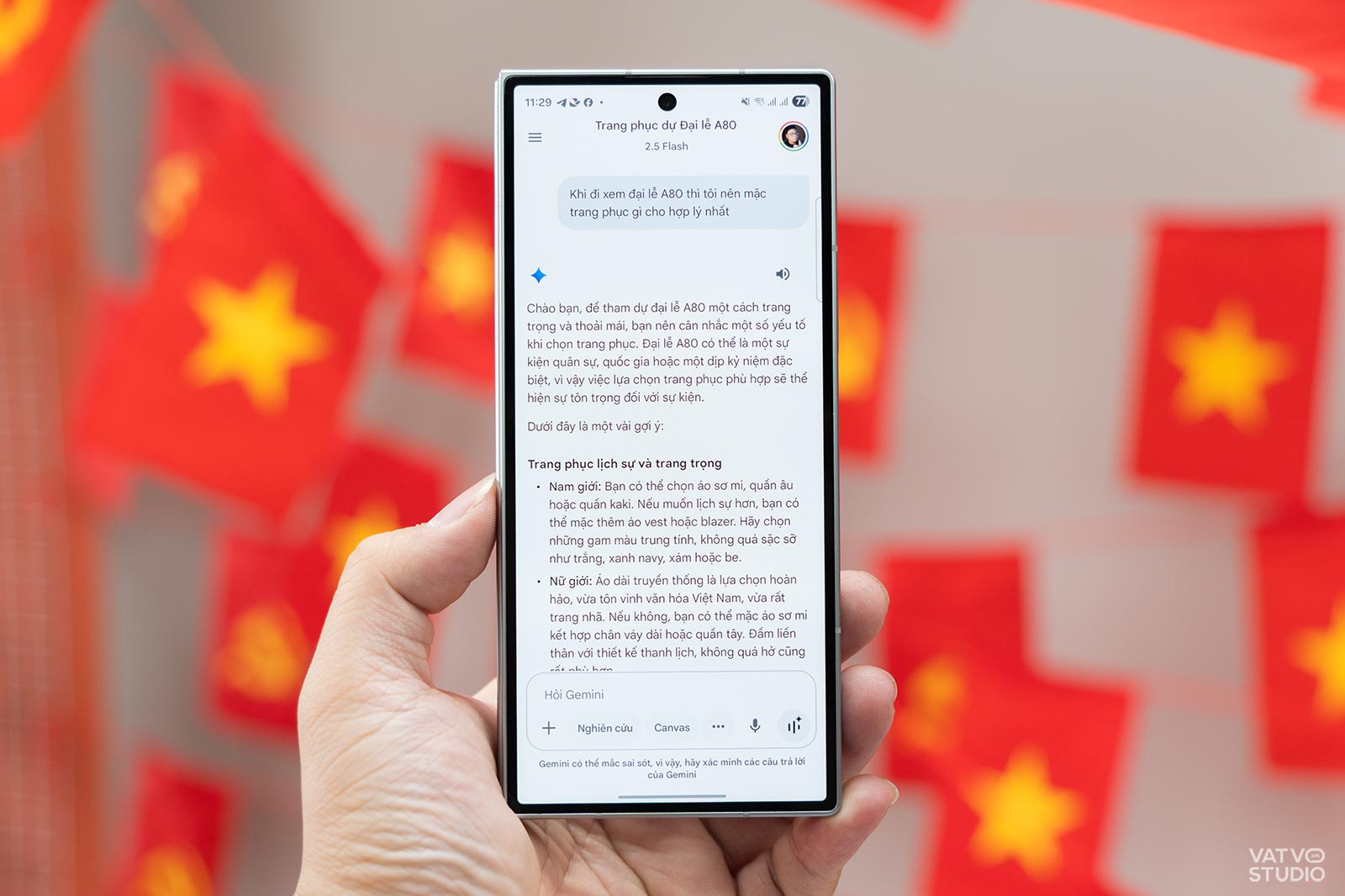 Cuối cùng, để chuẩn bị cho một ngày dài hoạt động ngoài trời, mình cũng không quên hỏi Gemini Live: “Mình nên mặc trang phục như thế nào và mang theo những gì để tiện cho việc xem diễu binh từ sáng sớm?”. Galaxy AI đã gợi ý một bộ trang phục năng động với áo cờ đỏ sao vàng, quần tối màu, đi giày thể thao, và nhắc nhở mang theo những vật dụng cần thiết như nước uống, sạc dự phòng, và một chiếc áo mưa mỏng vì theo dự báo trong ngày sẽ có mưa.