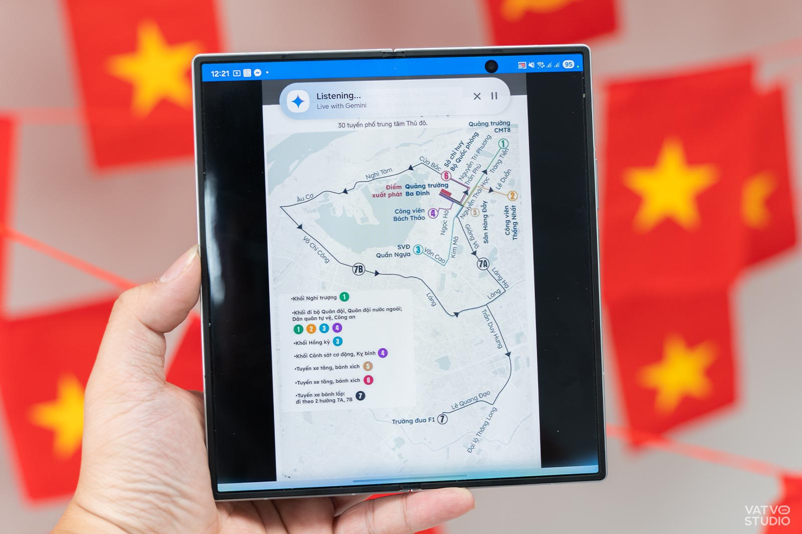 Chỉ vài giây sau, Galaxy AI trên Galaxy Z Fold7 nhanh chóng đưa ra câu trả lời về ý nghĩa của từng khối, giúp mình tiết kiệm đáng kể thời gian tìm kiếm thông tin. Nhờ đó, mình đã quyết định chọn một vị trí ở giữa phố Tràng Thi, nơi có tầm nhìn thoáng đãng để có thể chiêm ngưỡng trọn vẹn sự trang nghiêm của khối diễu binh, diễu hành.