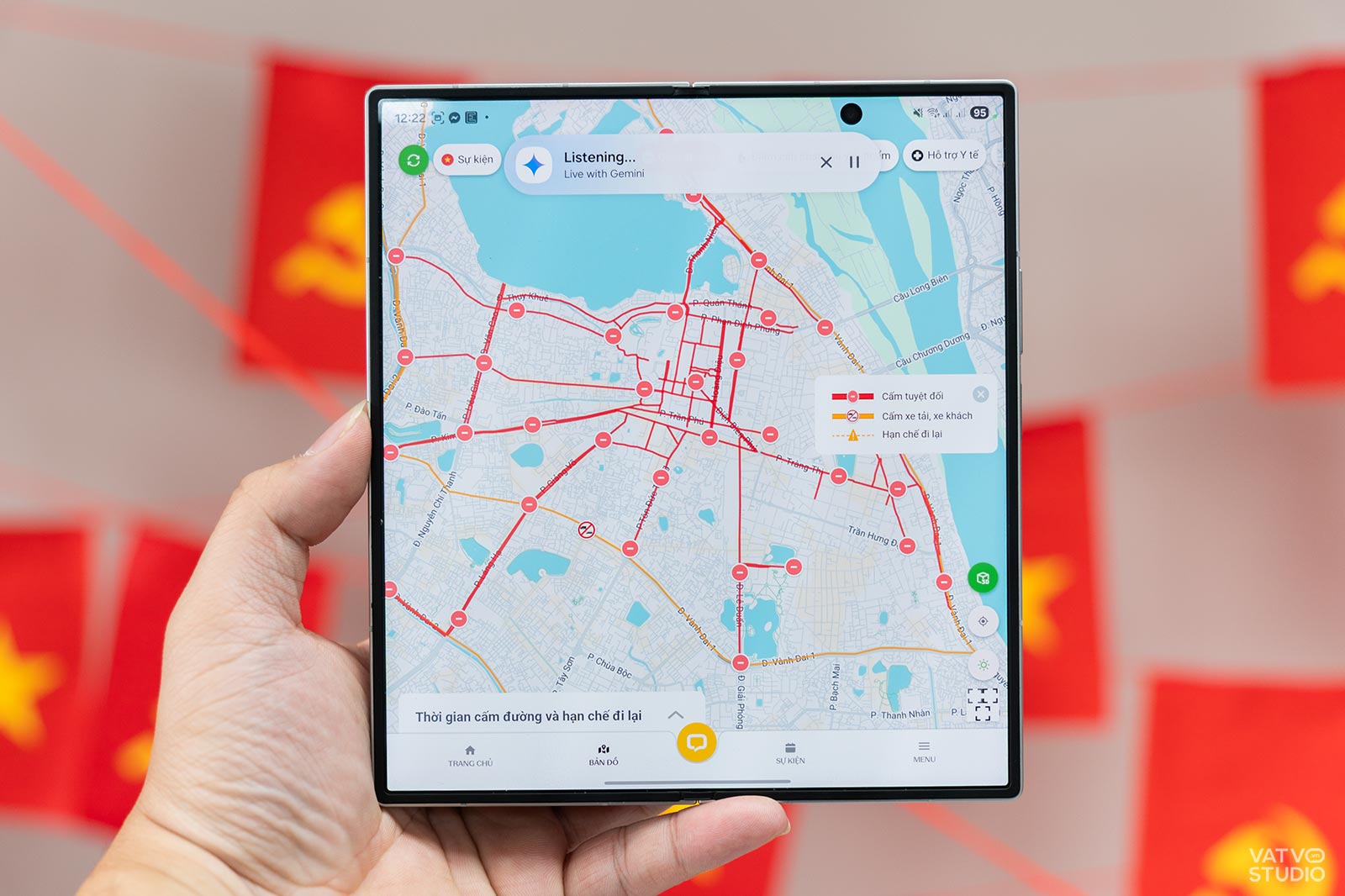 Cụ thể hơn, mình chỉ cần mở bản đồ cấm đường đã lưu sẵn trong máy hay ứng dụng A80 – Tự hào Việt Nam. Sau đó, kích hoạt Gemini Live trên Galaxy Z Fold7, sử dụng tính năng Share Screen (Chia sẻ màn hình) và đặt câu hỏi: “Đây là bản đồ các tuyến đường bị cấm. Mình đang ở nhà và muốn đến Tràng Tiền thì nên đi đường nào cho hợp lý?”
