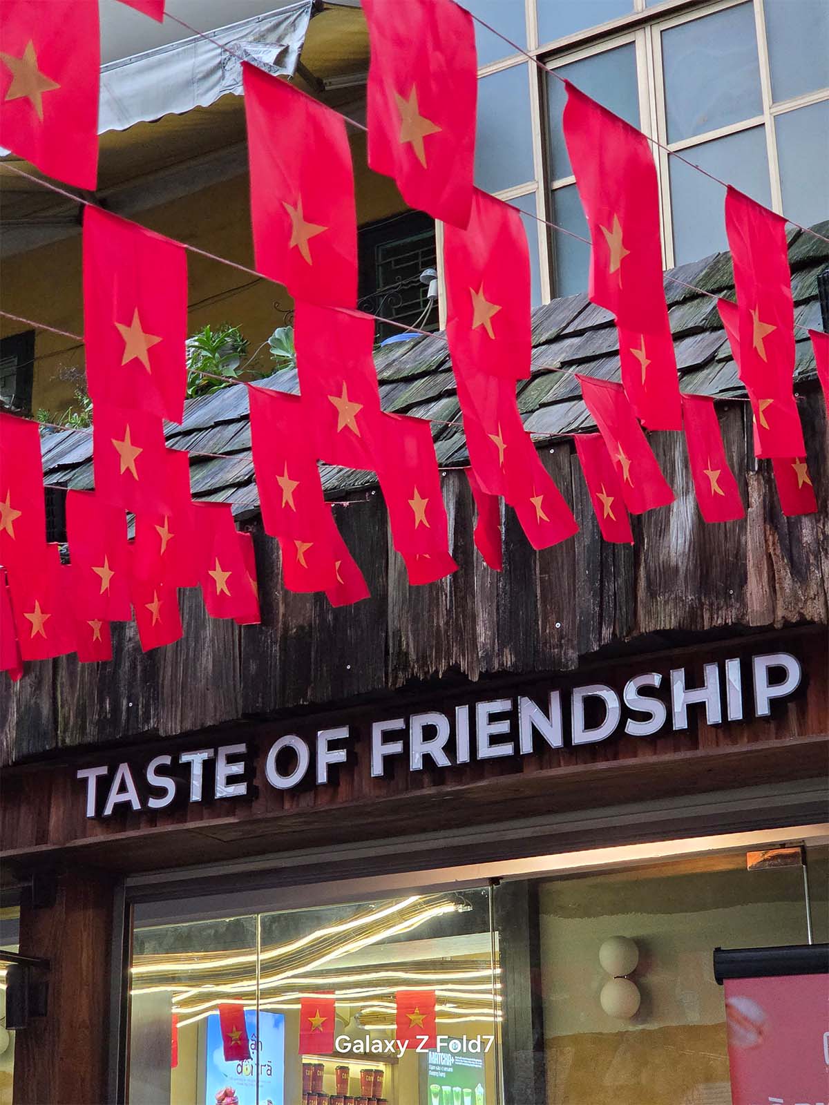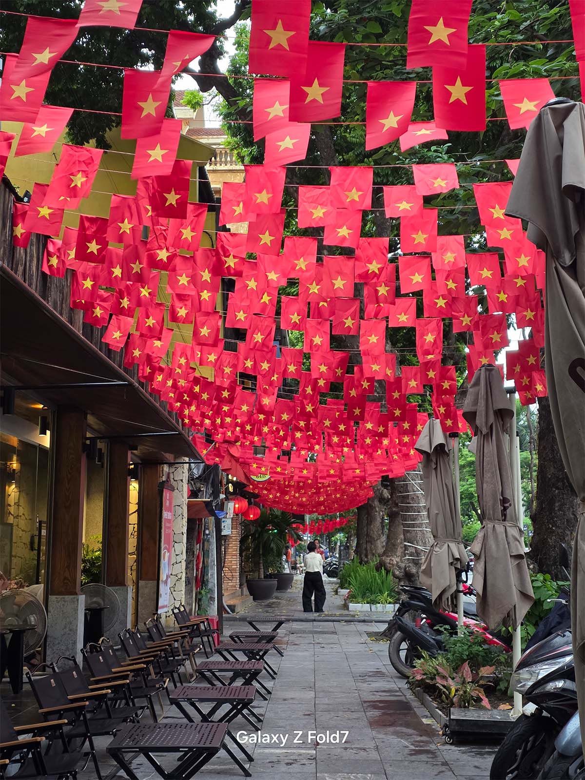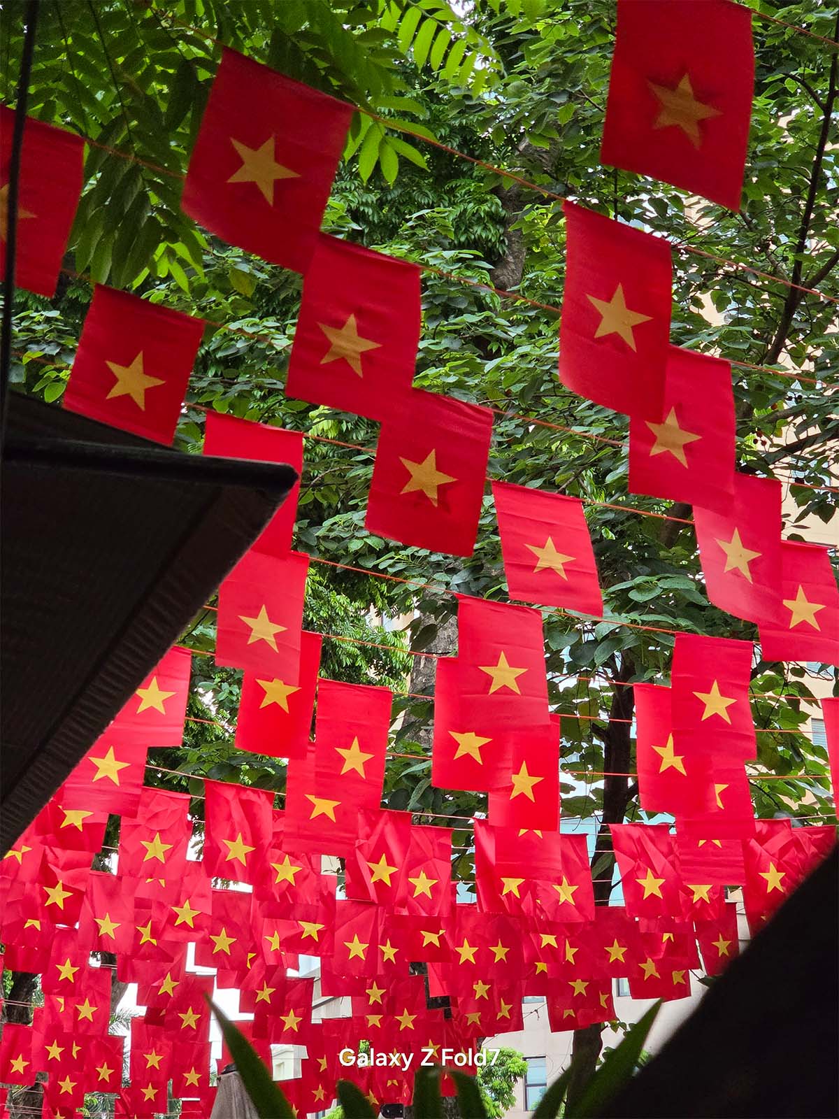 Với camera 200MP, Galaxy Z Fold7 dễ dàng ghi trọn những khoảnh khắc đẹp đó. Màu sắc của lá cờ đỏ thắm được tái tạo một cách sống động, không bị quá rực mà cũng không nhợt nhạt, mất chi tiết. Ở cả camera chính và camera telephoto, ảnh cho ra đều thu lại nhiều chi tiết, thể hiện rõ sự hân hoan, phấn khởi của cả thành phố.