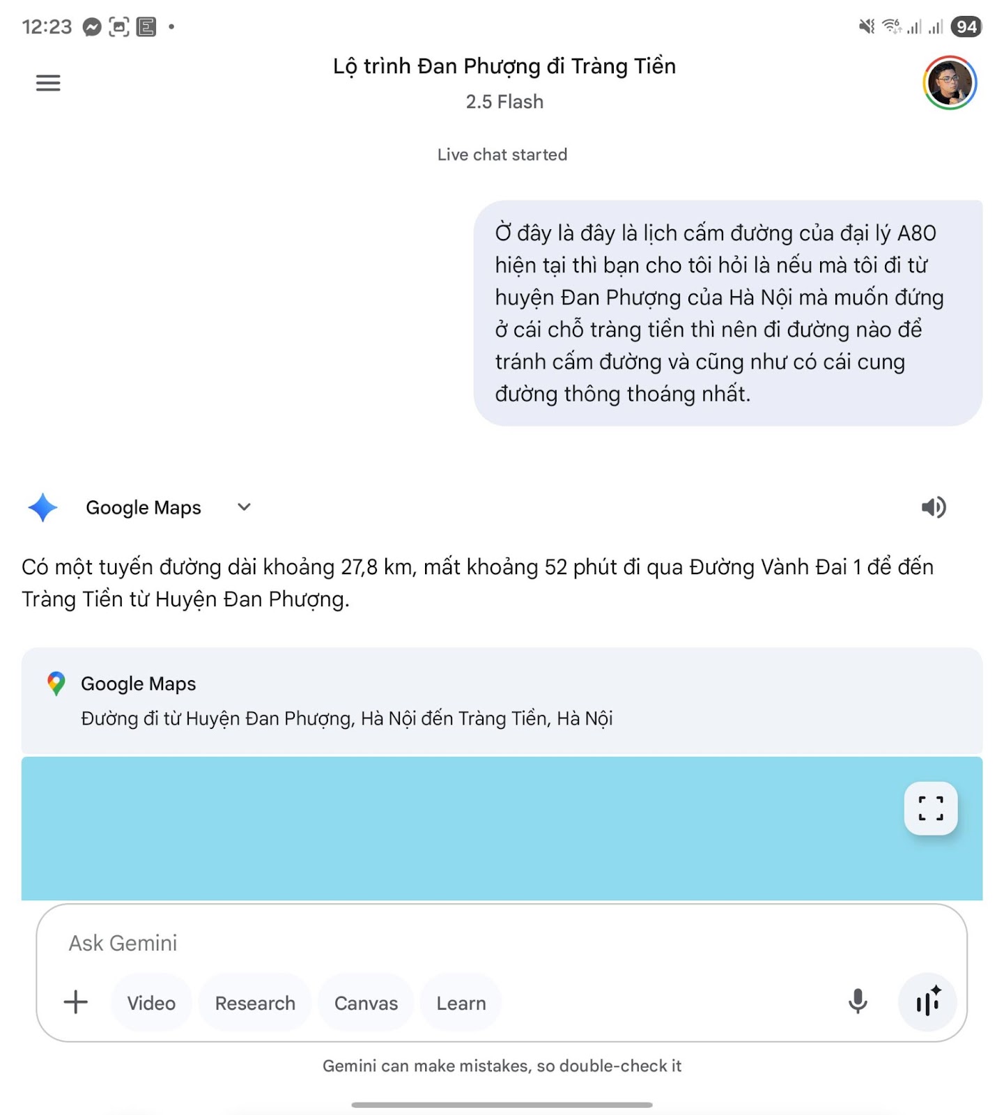 Chỉ sau vài giây, Gemini Live trên Galaxy Z Fold7 đã phân tích bản đồ và đưa ra một lộ trình chi tiết, gợi ý mình đi ven theo đường Vành đai 1, nơi không bị ảnh hưởng bởi lệnh cấm đường. Thậm chí, trong khung chat, Gemini còn cung cấp phím tắt để mở điều hướng bằng Google Maps. Chưa kể, màn hình lớn của Galaxy Z Fold7 khi mở ra cũng giúp việc xem bản đồ và các chỉ dẫn trở nên trực quan và dễ dàng hơn rất nhiều.