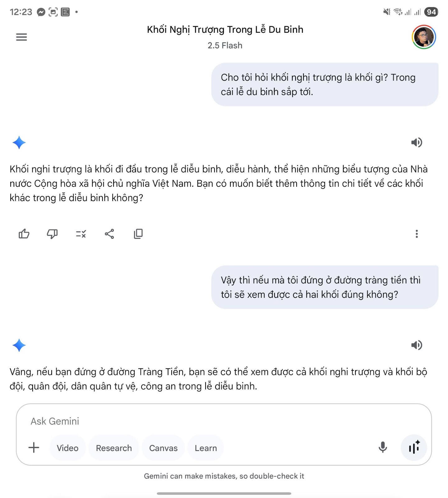 Khi đã có được vị trí, một vấn đề khác lại nảy sinh: đứng ở đâu để có góc nhìn đẹp nhất? Lễ diễu binh có hàng chục khối diễu hành khác nhau, mỗi khối lại mang một ý nghĩa và vẻ đẹp riêng. Để đưa ra quyết định, mình chỉ cần mở bản đồ các khối diễu binh, sau đó khởi động tính năng Share Screen và hỏi Gemini Live: “Khối nghị trượng là gì trong lễ diễu binh? Nếu tôi đứng ở phố Tràng Thi thì có thể xem được bao nhiêu khối?”