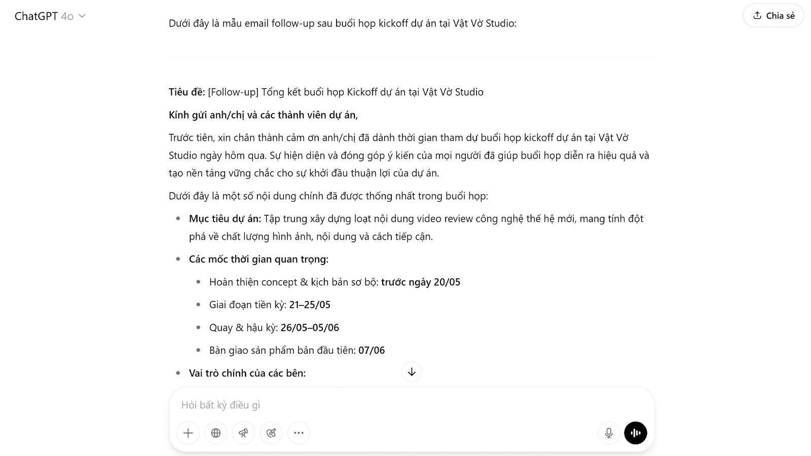 Được định vị là mô hình “omni” (toàn diện), GPT-4o là lựa chọn lý tưởng cho các công việc hàng ngày. Từ việc lên ý tưởng, tóm tắt văn bản, soạn thảo email cho đến tạo nội dung sáng tạo, GPT-4o đều có thể đáp ứng hiệu quả. Điểm mạnh của mô hình này nằm ở tính đa năng và khả năng xử lý đa phương thức, chấp nhận nhiều định dạng đầu vào như văn bản, hình ảnh, tài liệu, file CSV, âm thanh và video. Điều này giúp GPT-4o trở thành một trợ lý ảo toàn diện, có khả năng cung cấp phản hồi trực quan và dễ hiểu, phù hợp cho công việc văn phòng và các nhu cầu sáng tạo cơ bản.