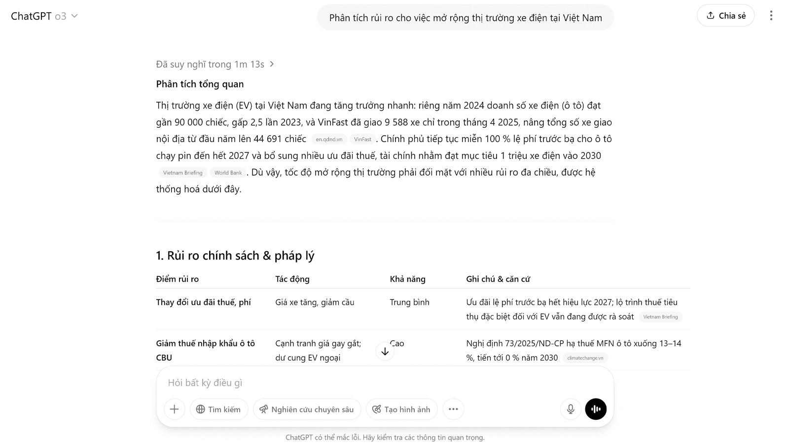 Khi đối mặt với những vấn đề đòi hỏi sự tổng hợp thông tin từ nhiều nguồn, suy luận đa tầng và phân tích chuyên sâu, OpenAI o3 là mô hình mạnh mẽ nhất. Nó chuyên về lập luận logic, phân tích kinh doanh toàn diện, viết mã phức tạp, giải toán nâng cao và phân tích hình ảnh. Khả năng đáng chú ý của o3 là tự động sử dụng các công cụ (tìm kiếm web, phân tích tệp) để thực hiện nhiều tác vụ, biến nó thành một “đặc vụ AI” thực thụ.