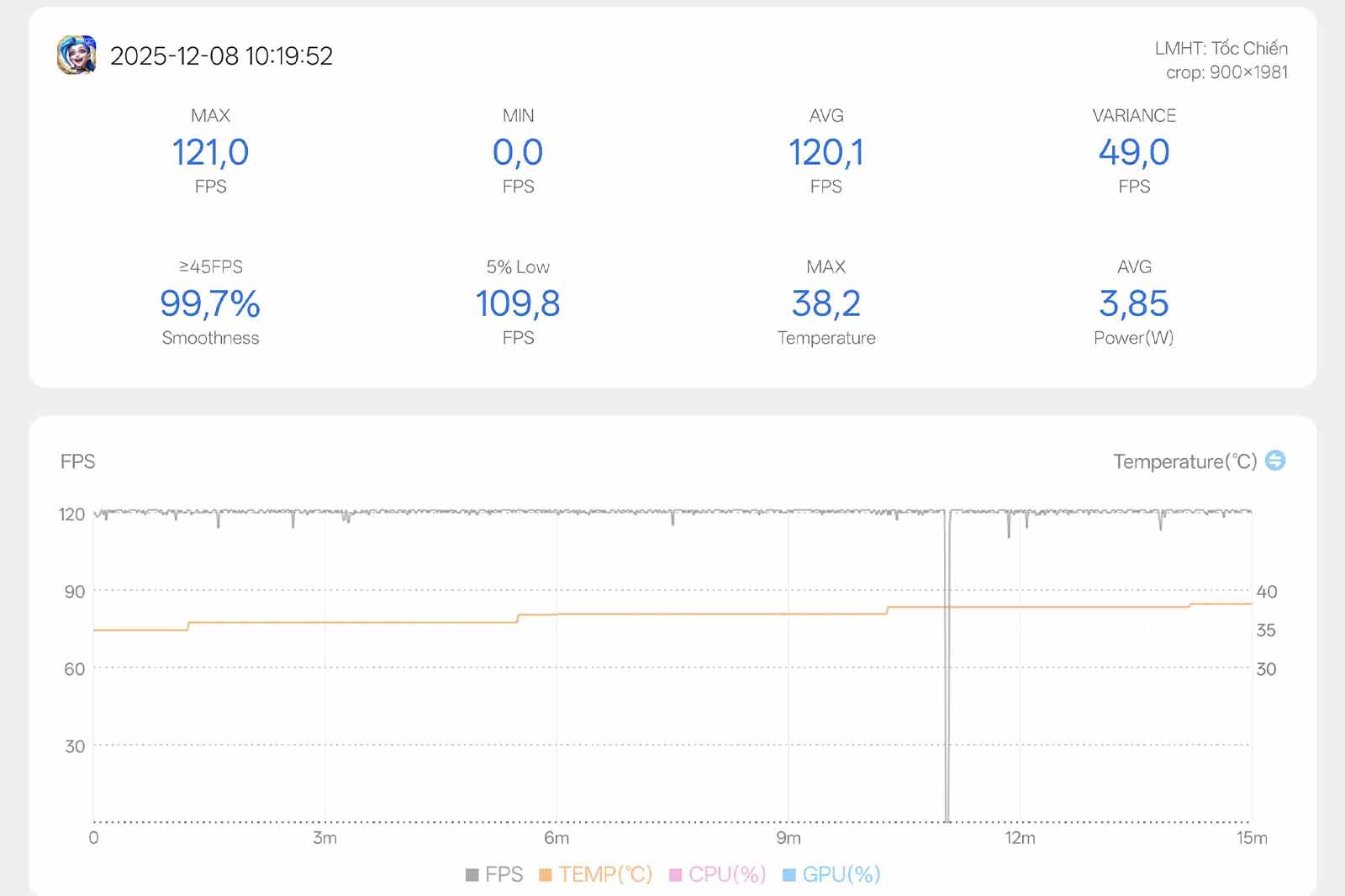 Đầu tiên, với LMHT: Tốc Chiến, mình thiết lập đồ hoạ ở mức Cao và 120FPS. Đúng như kỳ vọng, Snapdragon 8 Gen 5 trên OnePlus Ace 6T xử lý tựa game này khá nhẹ nhàng. Biểu đồ FPS cho ra một đường thẳng, với mốc trung bình 120,1 FPS. Trong biểu đồ, những điểm sụt giảm về 0 hoàn toàn là do thời gian chuyển cảnh hoặc tải trận đấu. Đáng khen là mức tiêu thụ điện năng khá tối ưu, chỉ khoảng 3,85W.