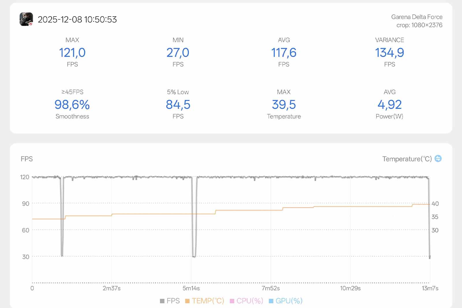 Chuyển sang Delta Force, một tựa game bắn súng có đồ họa chi tiết hơn. Máy vẫn duy trì khả năng chơi game mượt mà với FPS trung bình đạt 117,6. Trên biểu đồ có xuất hiện vài điểm mà khung hình bị hạ xuống mốc 30 FPS, nhưng thực ra đây chỉ là khoảnh khắc nhân vật chờ hồi sinh. Trong các pha giao tranh thực tế, máy không hề gặp hiện tượng giật lag hay khó chịu.