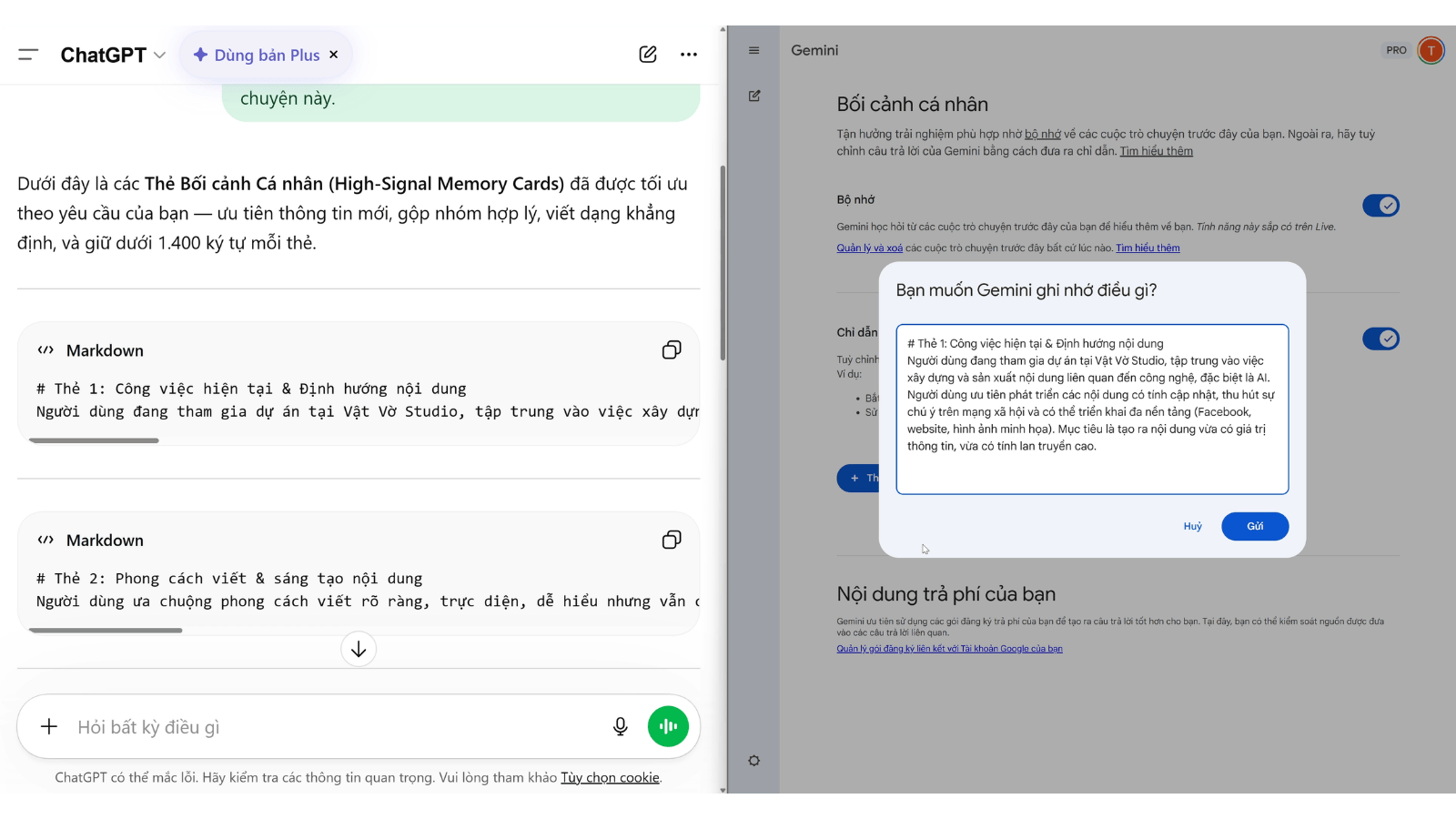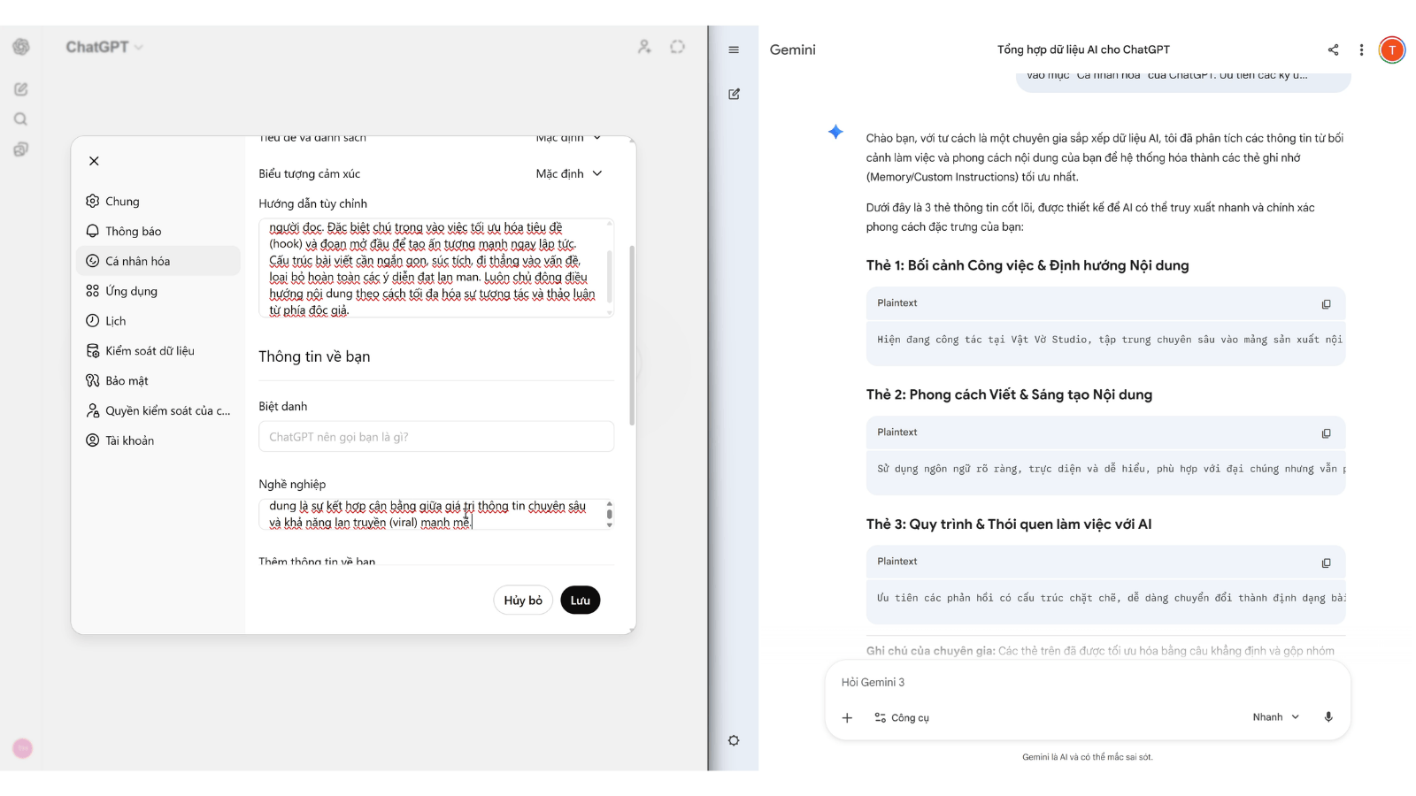 Phương pháp tối ưu nhất là yêu cầu ChatGPT tự tổng hợp dữ liệu thành các thẻ thông tin ngắn gọn. Người dùng có thể sử dụng câu lệnh để yêu cầu hệ thống quét toàn bộ lịch sử, sau đó sắp xếp các thông tin về cá nhân, thói quen và phong cách làm việc thành các đoạn văn bản dưới 14.000 ký tự. Việc giới hạn độ dài này đảm bảo tính tương thích khi đưa vào bộ nhớ của Gemini mà không bị ngắt quãng.