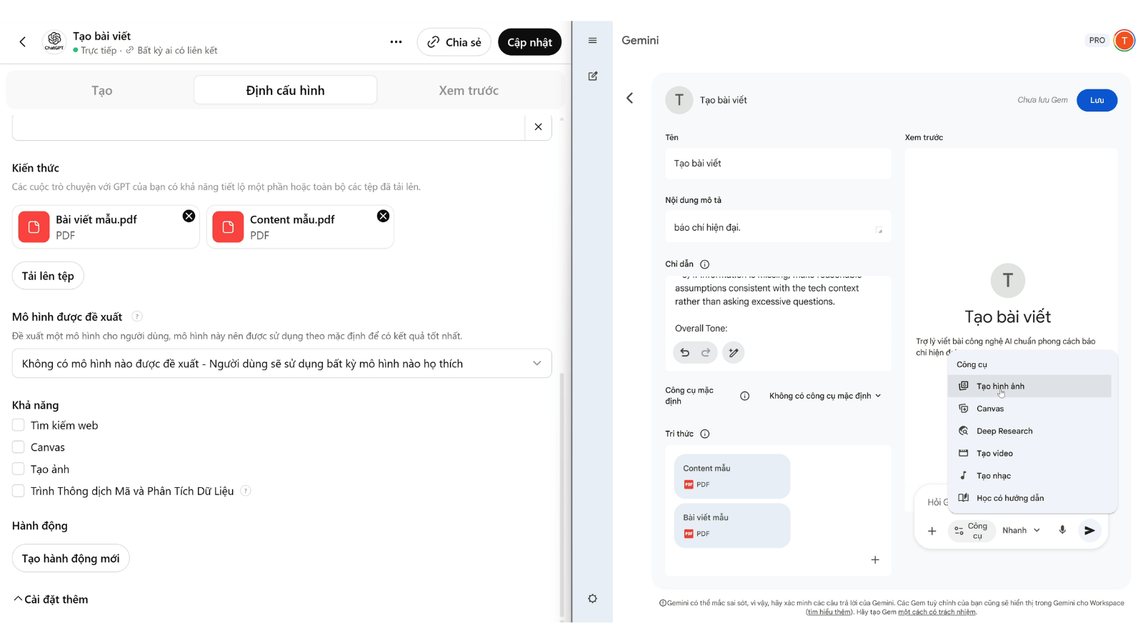 Khi tạo Gem mới, người dùng chỉ cần dán các hướng dẫn này vào mục cấu hình. Một ưu điểm nổi bật là Gemini cung cấp tính năng tự động viết lại để tối ưu hóa câu lệnh sao cho phù hợp với thuật toán của Google. Khác với ChatGPT yêu cầu người dùng phải bật/tắt thủ công các công cụ như tìm kiếm web hay tạo ảnh, Gemini Gems tích hợp sẵn các tính năng này và tự động kích hoạt dựa trên ngữ cảnh yêu cầu, tạo ra trải nghiệm sử dụng thuận tiện hơn.
