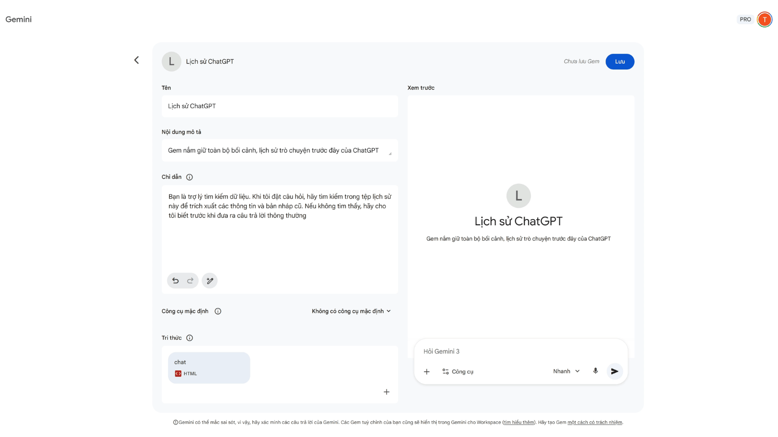 Để tận dụng dữ liệu này trên nền tảng của Google, tính năng Gemini Gems là công cụ hỗ trợ đắc lực. Người dùng có thể tạo một Gem mới với tên gọi “Tra cứu lịch sử ChatGPT”, sau đó tải tệp chat.html lên. Với khả năng xử lý tài liệu dài, Gemini sẽ đóng vai trò như một thủ thư, giúp tìm kiếm nhanh các bản nháp hoặc thông tin quan trọng từ quá trình sử dụng trước đây.