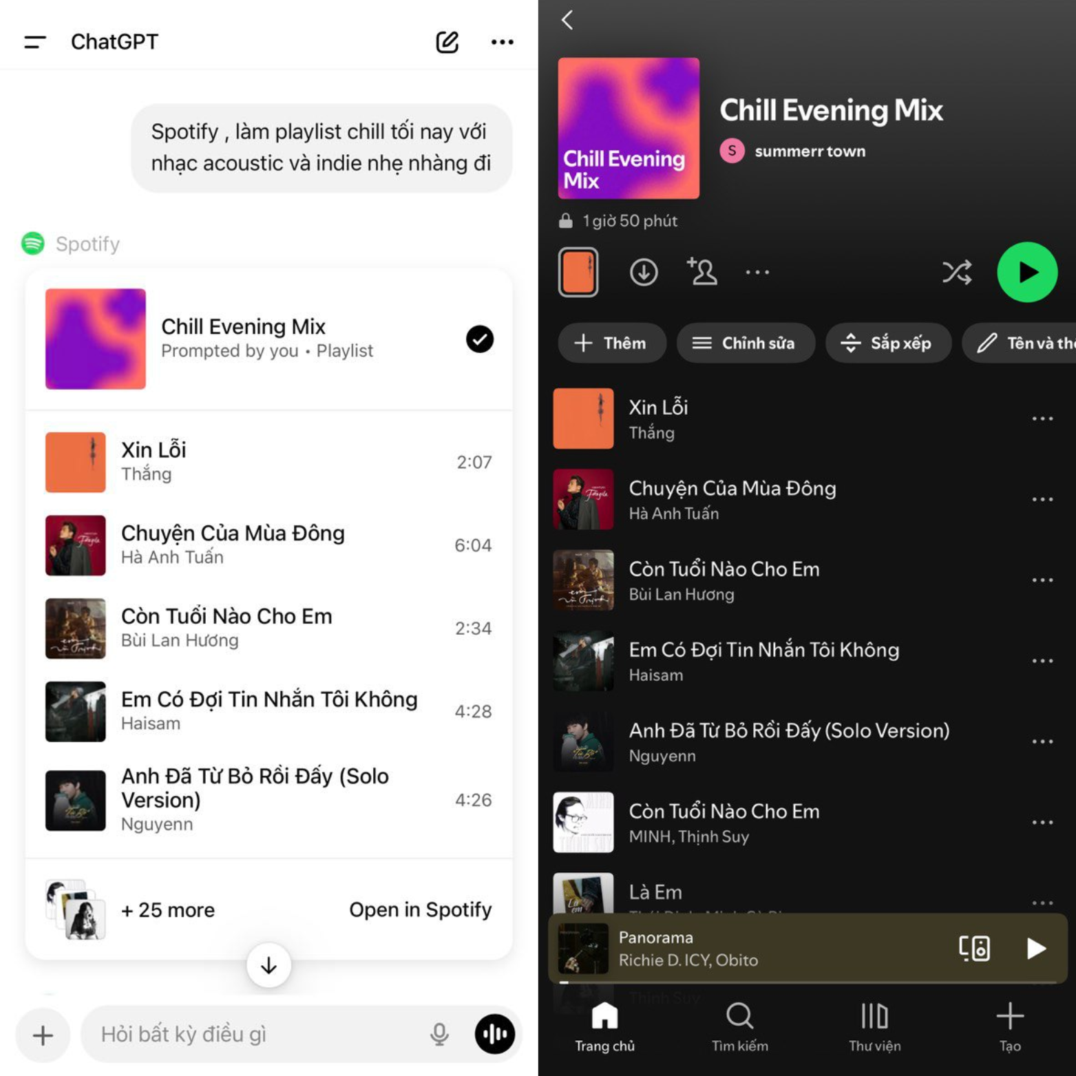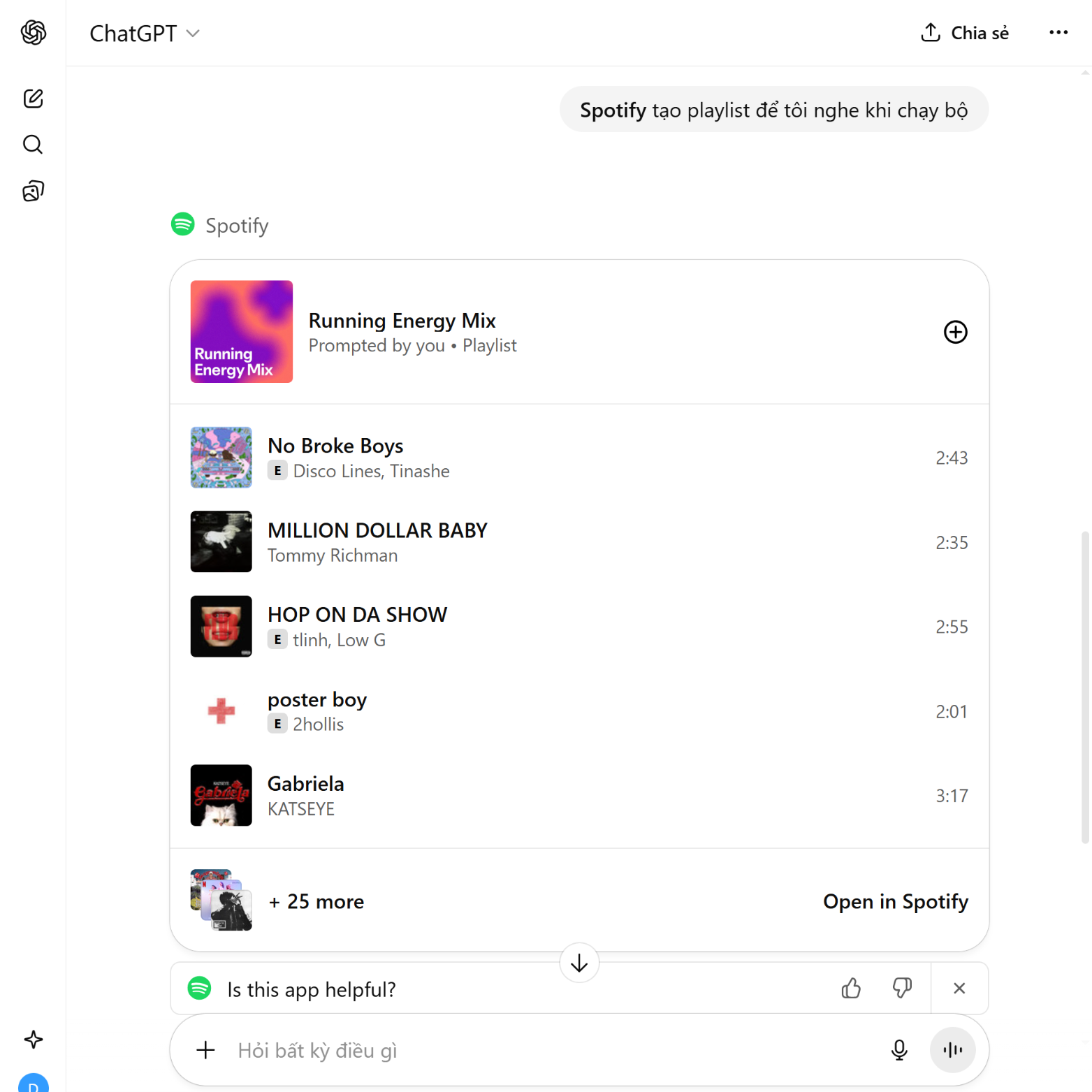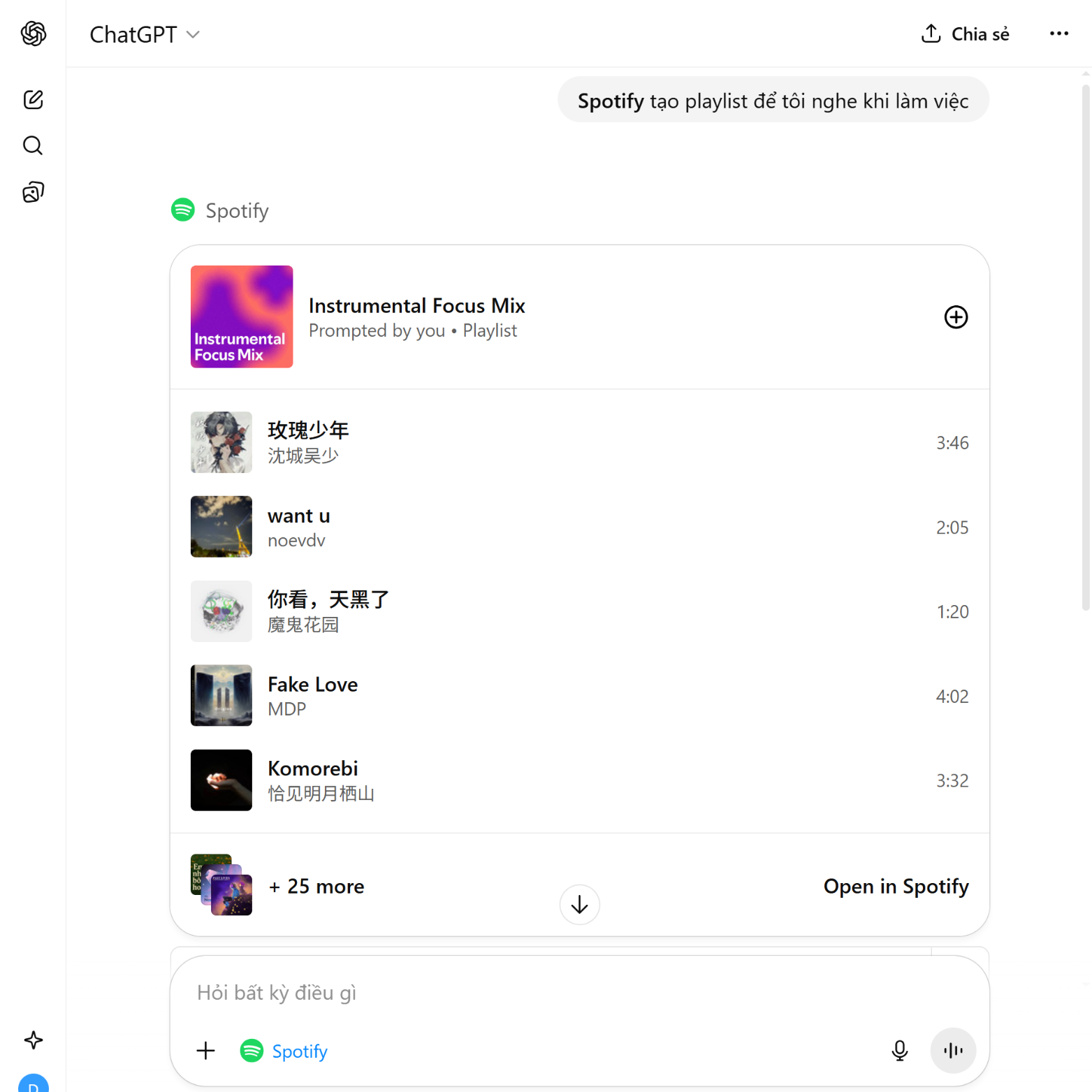 ChatGPT hiện đã cho phép người dùng Việt Nam kết nối trực tiếp với tài khoản Spotify. Trước đây khi mới ra mắt, tính năng này chỉ khả dụng ở Mỹ và một vài quốc gia khác. Sự tích hợp này mang đến khả năng tạo playlist, nhận gợi ý nhạc và quản lý thư viện Spotify chỉ bằng các câu lệnh trò chuyện đơn giản. Tính năng này giúp tiết kiệm thời gian cho người dùng, đặc biệt khi cần tạo nhanh một danh sách nhạc cho một tâm trạng hoặc sự kiện cụ thể mà không cần tìm kiếm thủ công.