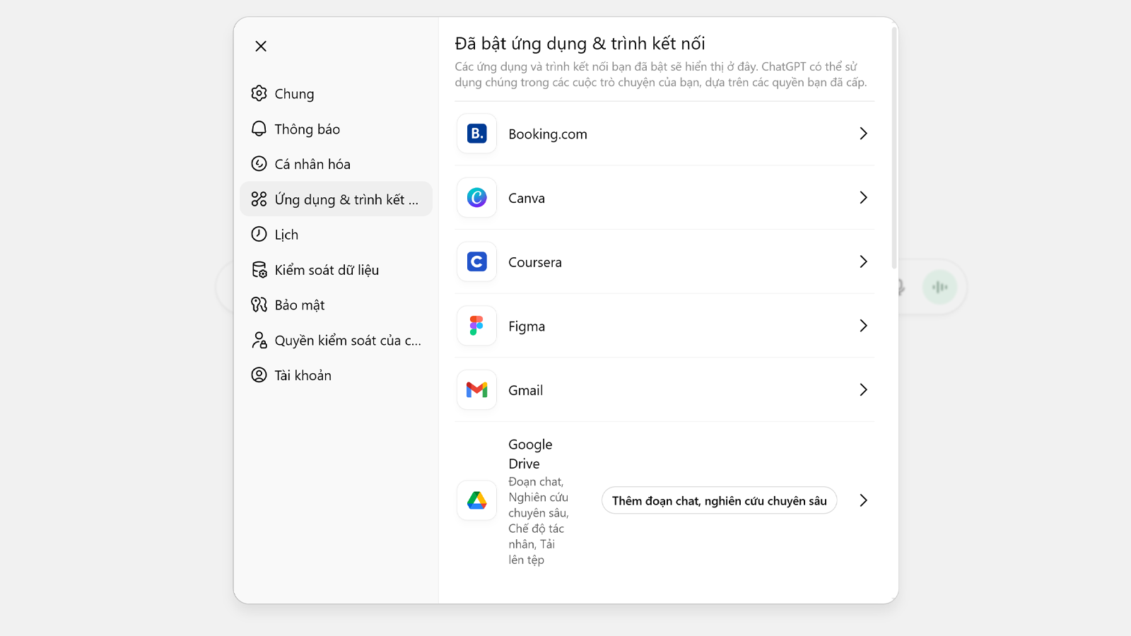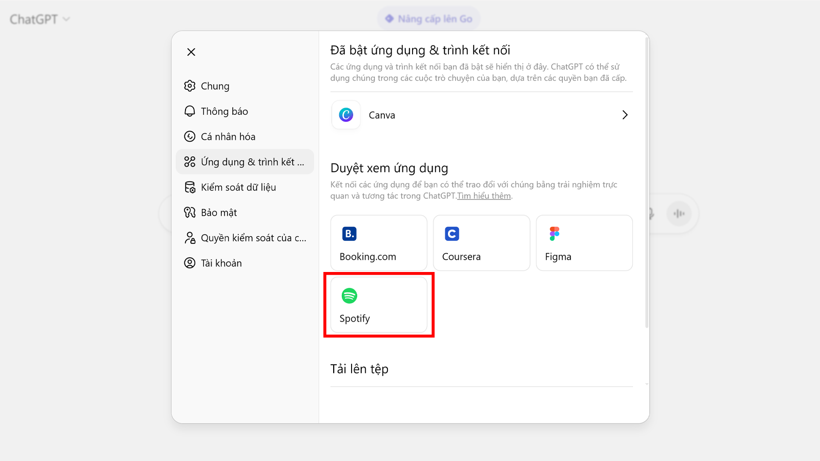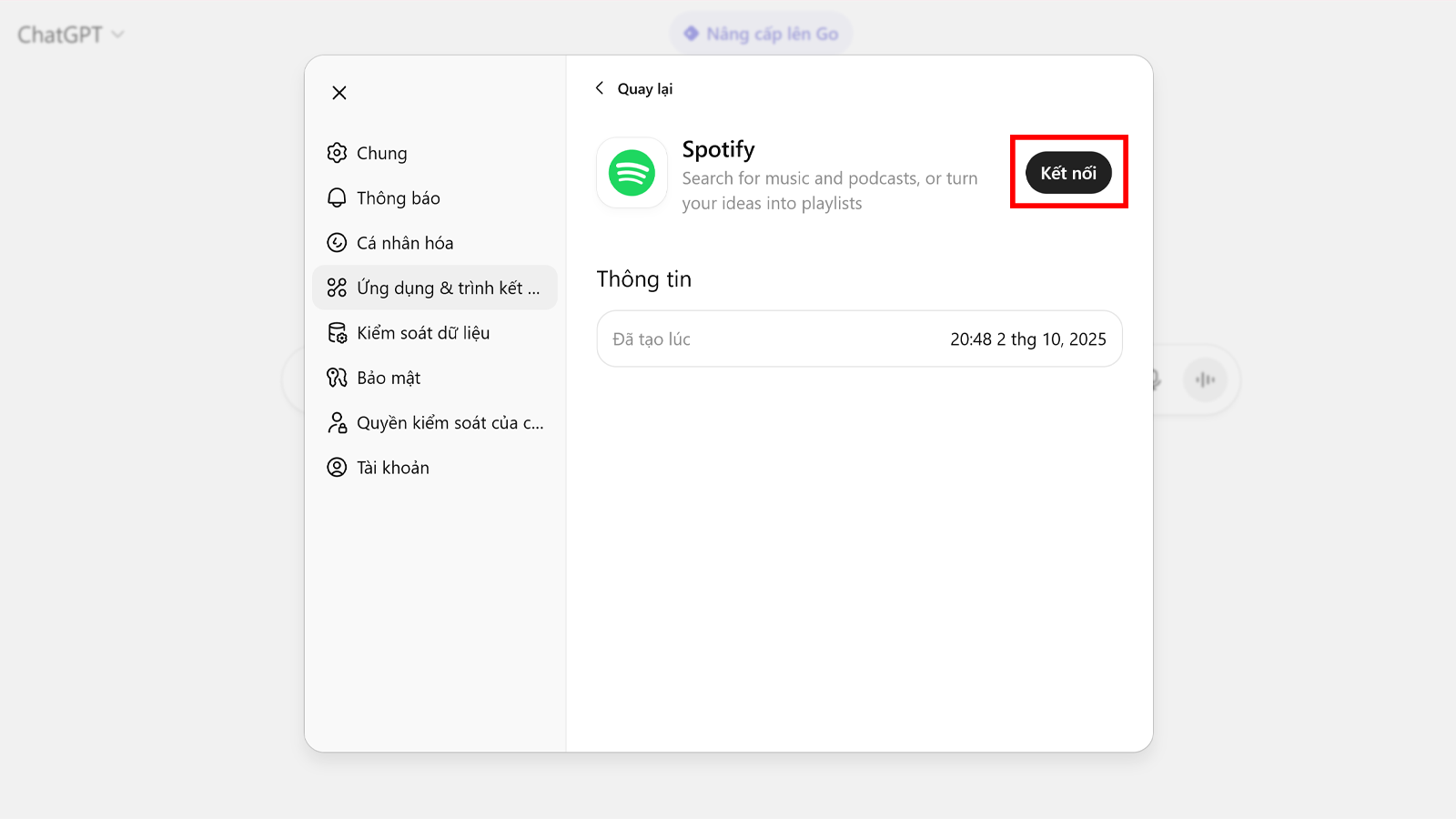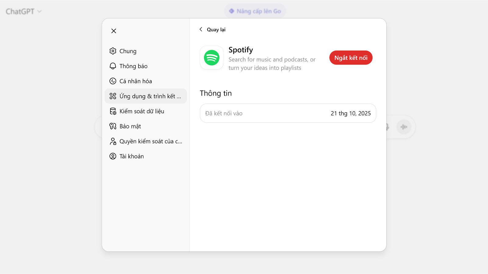 ChatGPT hiện đã cho phép người dùng Việt Nam kết nối trực tiếp với tài khoản Spotify. Trước đây khi mới ra mắt, tính năng này chỉ khả dụng ở Mỹ và một vài quốc gia khác. Sự tích hợp này mang đến khả năng tạo playlist, nhận gợi ý nhạc và quản lý thư viện Spotify chỉ bằng các câu lệnh trò chuyện đơn giản. Tính năng này giúp tiết kiệm thời gian cho người dùng, đặc biệt khi cần tạo nhanh một danh sách nhạc cho một tâm trạng hoặc sự kiện cụ thể mà không cần tìm kiếm thủ công.