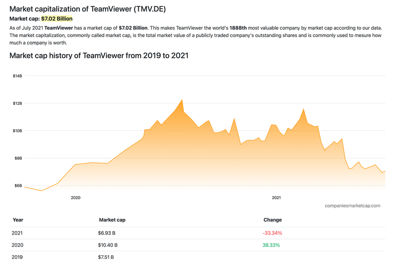 Mãi tới tháng 4 năm 2021, cổ phiếu của TeamViewer xuống giá trầm trọng và hiện tại chỉ còn ở ngưỡng 7 tỷ USD. Tuy nhiên theo các chuyên gia nhận định, sức tăng trưởng của ứng dụng này là vẫn còn và đà giảm này chỉ là chu kỳ giảm chung của thị trường chứng khoán. TeamViewer vẫn hoàn toàn có thể phát triển hơn nữa và lập thêm các đỉnh khác với mô hình kinh doanh hiện tại.