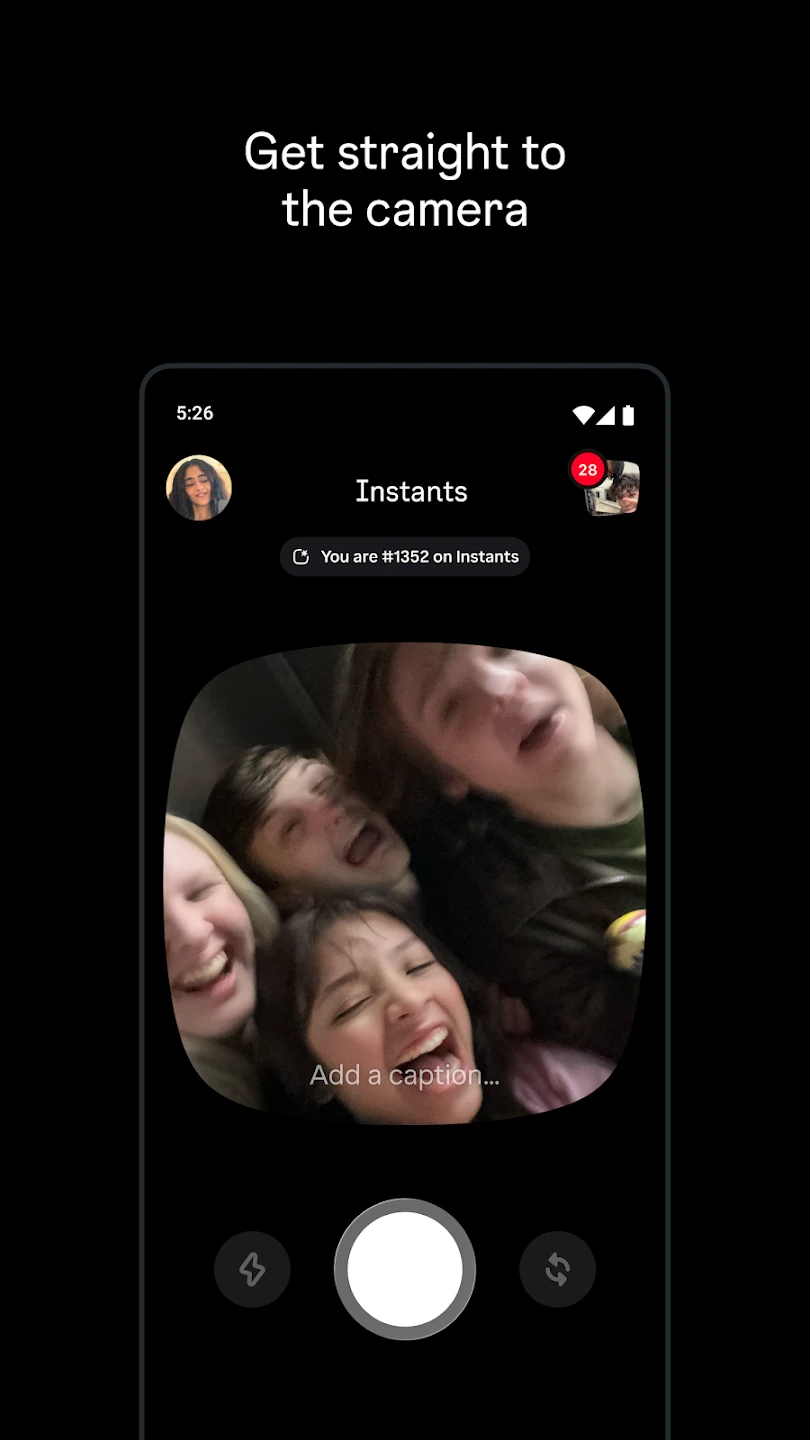 Với Instants, người dùng có thể chụp ảnh chỉ bằng một lần chạm và không được phép chỉnh sửa. Ứng dụng không hỗ trợ tải ảnh lên từ thư viện điện thoại mà chỉ cho phép sử dụng camera trực tiếp trong ứng dụng. Mặc dù người dùng có thể thêm văn bản vào các bức ảnh này, nhưng họ không thể can thiệp sâu hơn vào nội dung hình ảnh.