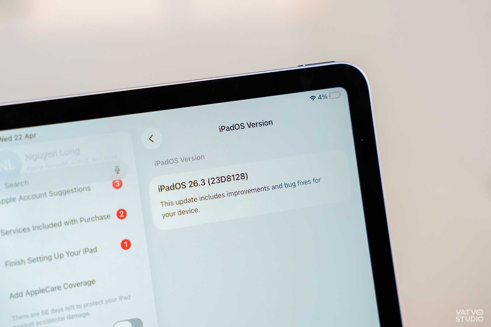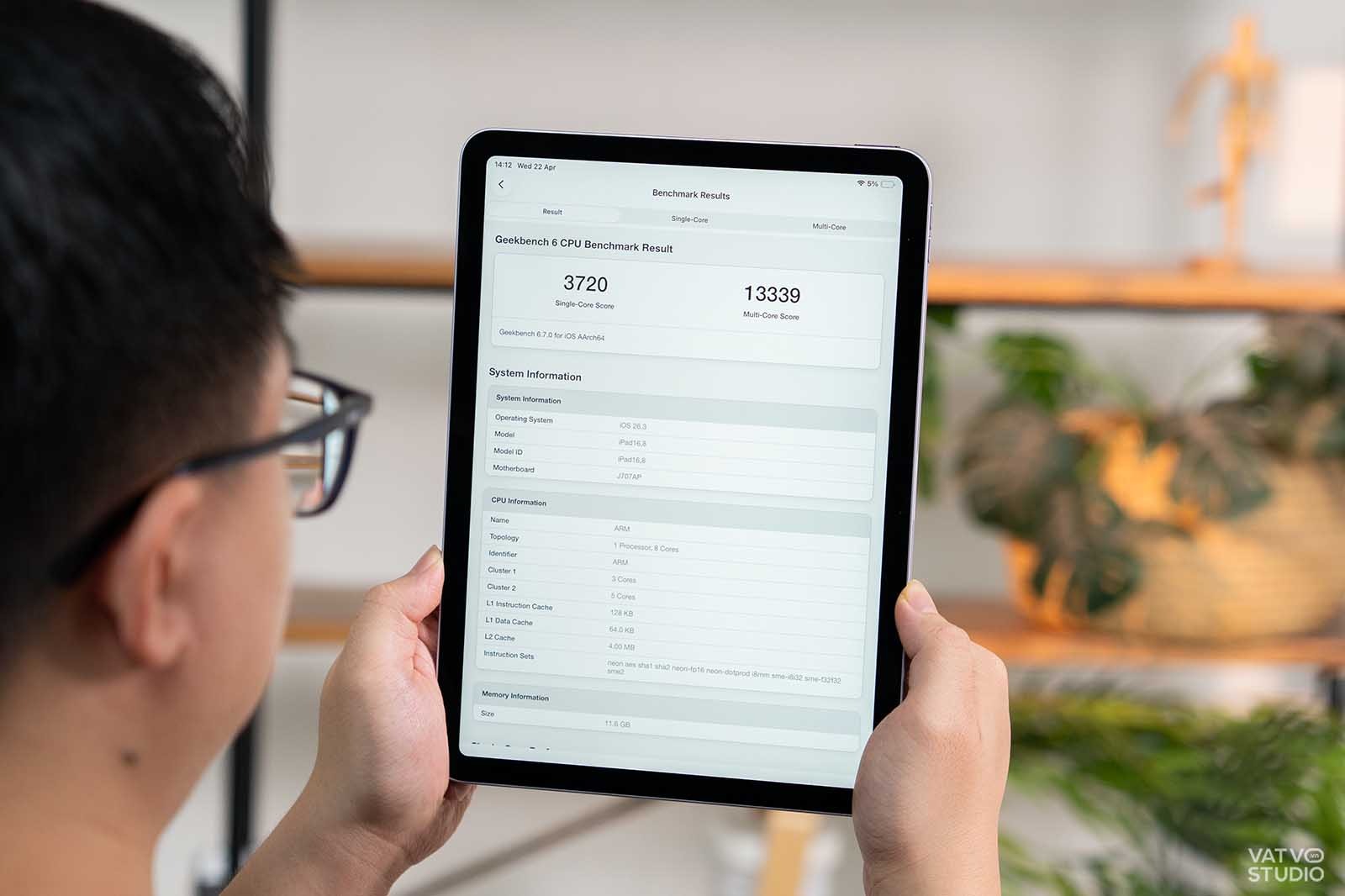 Điểm nhấn đầu tiên trên iPad Air M4 mà mình đánh giá cao chính là dung lượng RAM được nâng cấp mạnh mẽ từ 8GB lên 12GB. Đây là một con số ấn tượng, ngang bằng với dòng Pro M5 tiêu chuẩn và thậm chí vượt qua cả mẫu máy tính xách tay MacBook Neo. Trong bối cảnh giá linh kiện không ngừng tăng, việc hãng bổ sung dung lượng RAM mà vẫn duy trì giá bán cũ là một nỗ lực rất đáng khen ngợi.