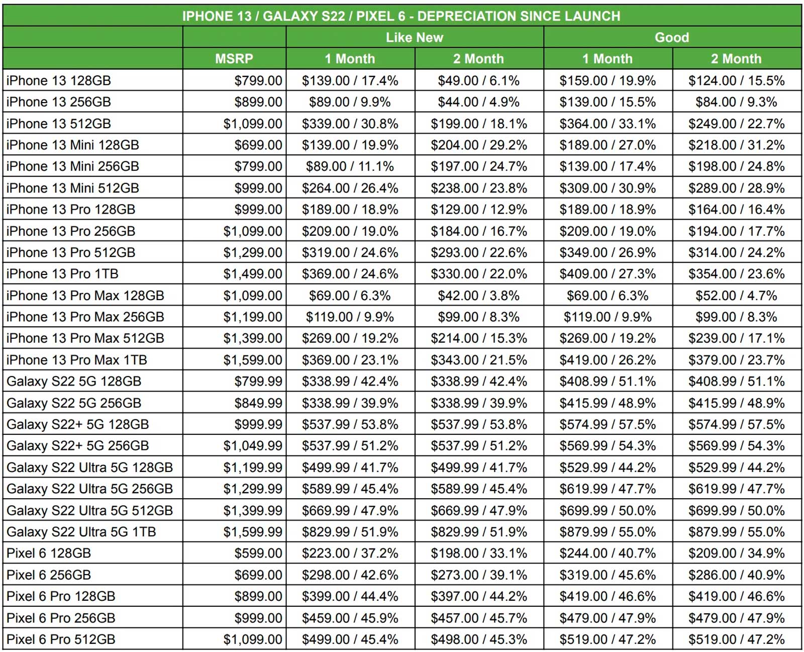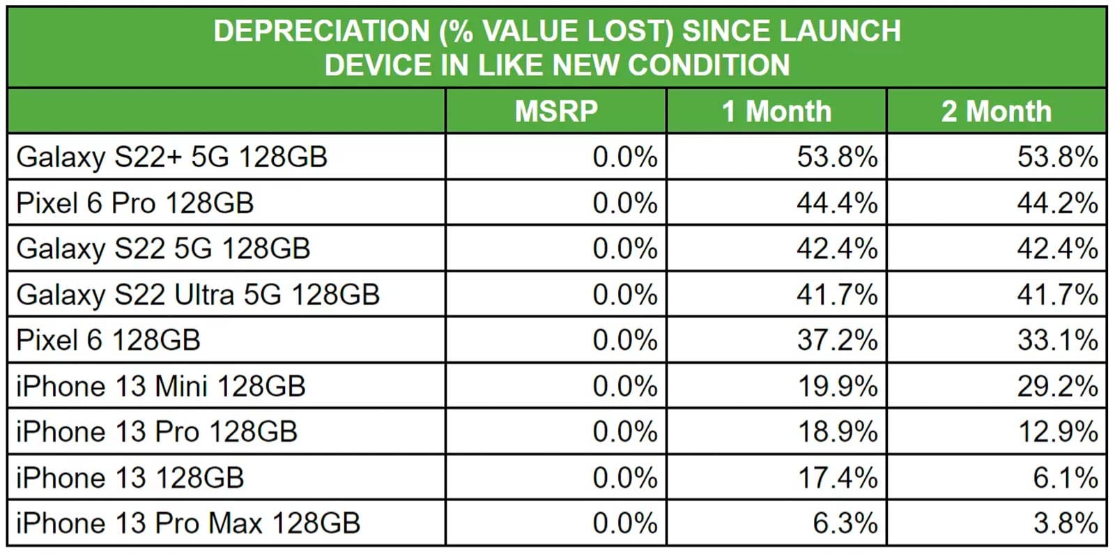 Mức giá khởi điểm của iPhone 13, Galaxy S22 và Pixel 6 lần lượt là: 799 USD, 799 USD và 599 USD. Sau 1 tháng ra mắt, iPhone 13 mất 18,7% giá trị trong khi Google Pixel 6 mất tới 43,1% giá và Galaxy S22 cũng mất tới 46,8% giá trị. Sau 2 tháng, mức thay đổi không chênh lệch quá nhiều so với tháng đầu, số liệu cụ thể lần lượt là iPhone 13 (16,4%), Pixel 6 (41,5%) và Galaxy S22 (46,8%).
