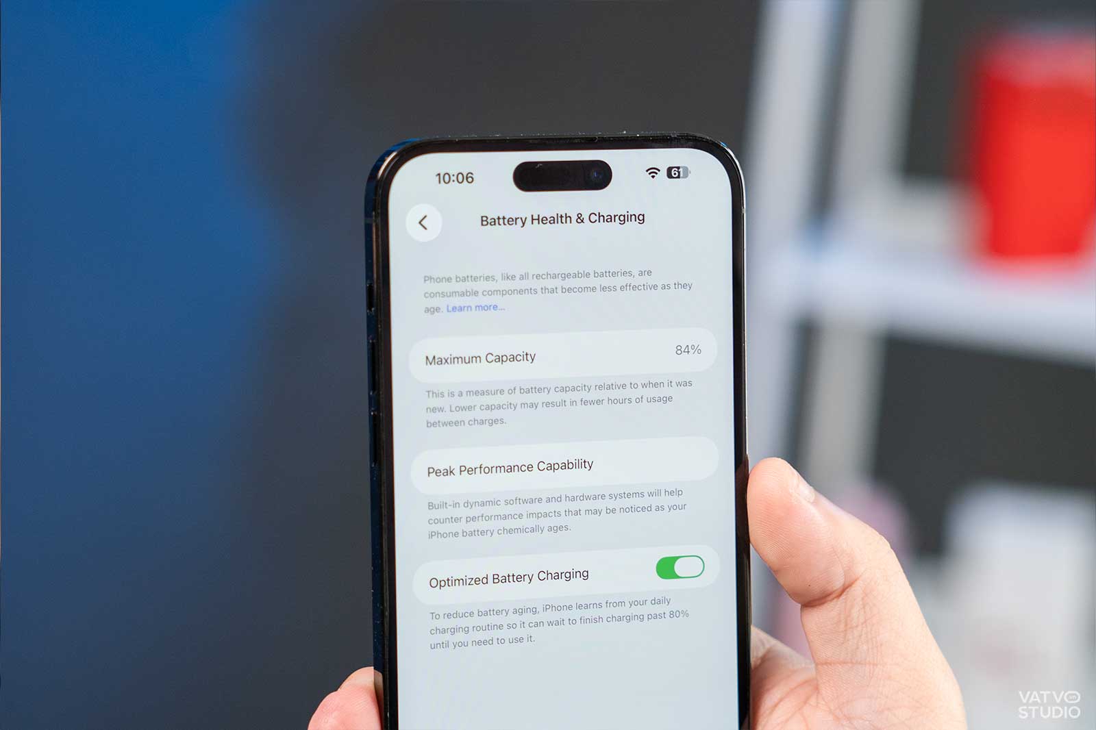 Khi mua một chiếc điện thoại đã qua sử dụng 3 năm, tuổi thọ pin là yếu tố đáng lo ngại. Chiếc máy mình đang sử dụng trong bài viết này chỉ còn dung lượng pin tối đa là 84%. Với mức dung lượng này, máy chỉ có thể đáp ứng nhu cầu sử dụng cơ bản với khoảng 5 – 6 giờ sáng màn hình, một con số khiêm tốn đối với một chiếc iPhone Pro Max.