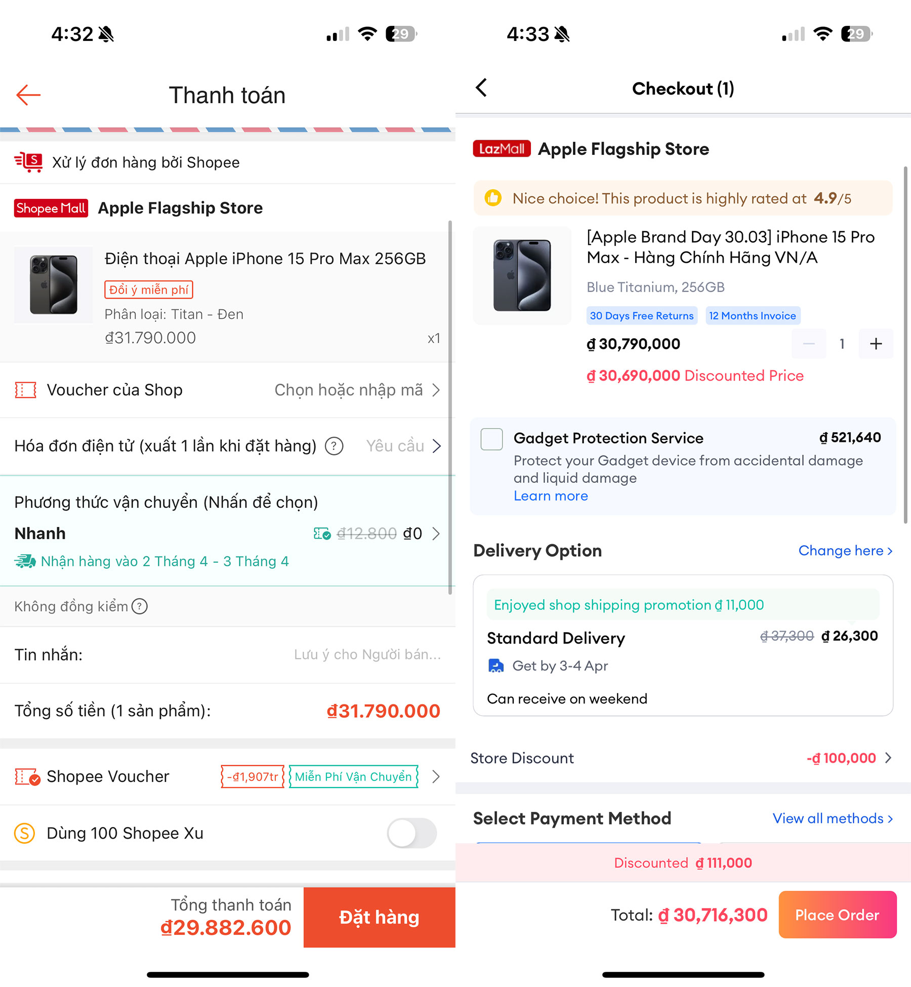Trên các sàn thương mại điện tử, iPhone 15 Pro Max cũng có mức giá hấp dẫn. Gian hàng Apple chính thức trên Shopee hiện niêm yết sản phẩm này với giá 31,79 triệu đồng, giảm còn 29,8 triệu đồng khi áp dụng mã giảm giá. Với Lazada, mức giá của iPhone 15 Pro Max là 30,7 triệu đồng. Tất nhiên, người dùng có thể tiết kiệm hơn bằng cách mua iPhone vào dịp sale 4/4 sắp tới. Khi đó, iPhone 15 Pro Max có thể giảm giá chỉ còn 27,5 – 28 triệu đồng.