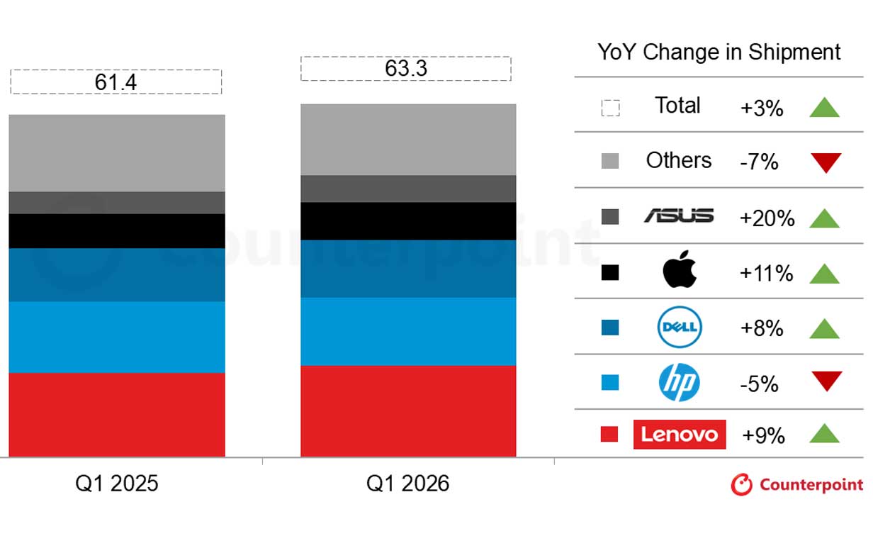 Dữ liệu sơ bộ từ Counterpoint Research cho thấy thị trường máy tính cá nhân (PC) toàn cầu đạt mức 63,3 triệu đơn vị trong quý 1 năm 2026, tăng trưởng 3,2% so với cùng kỳ năm trước. Kết quả này đến từ tâm lý mua sắm sớm của người dùng để tránh đợt tăng giá linh kiện sắp tới và nhu cầu nâng cấp phần cứng khi Windows 10 chuẩn bị ngừng hỗ trợ. Các hãng sản xuất lớn đang tận dụng triệt để chu kỳ làm mới thiết bị này để củng cố thị phần.