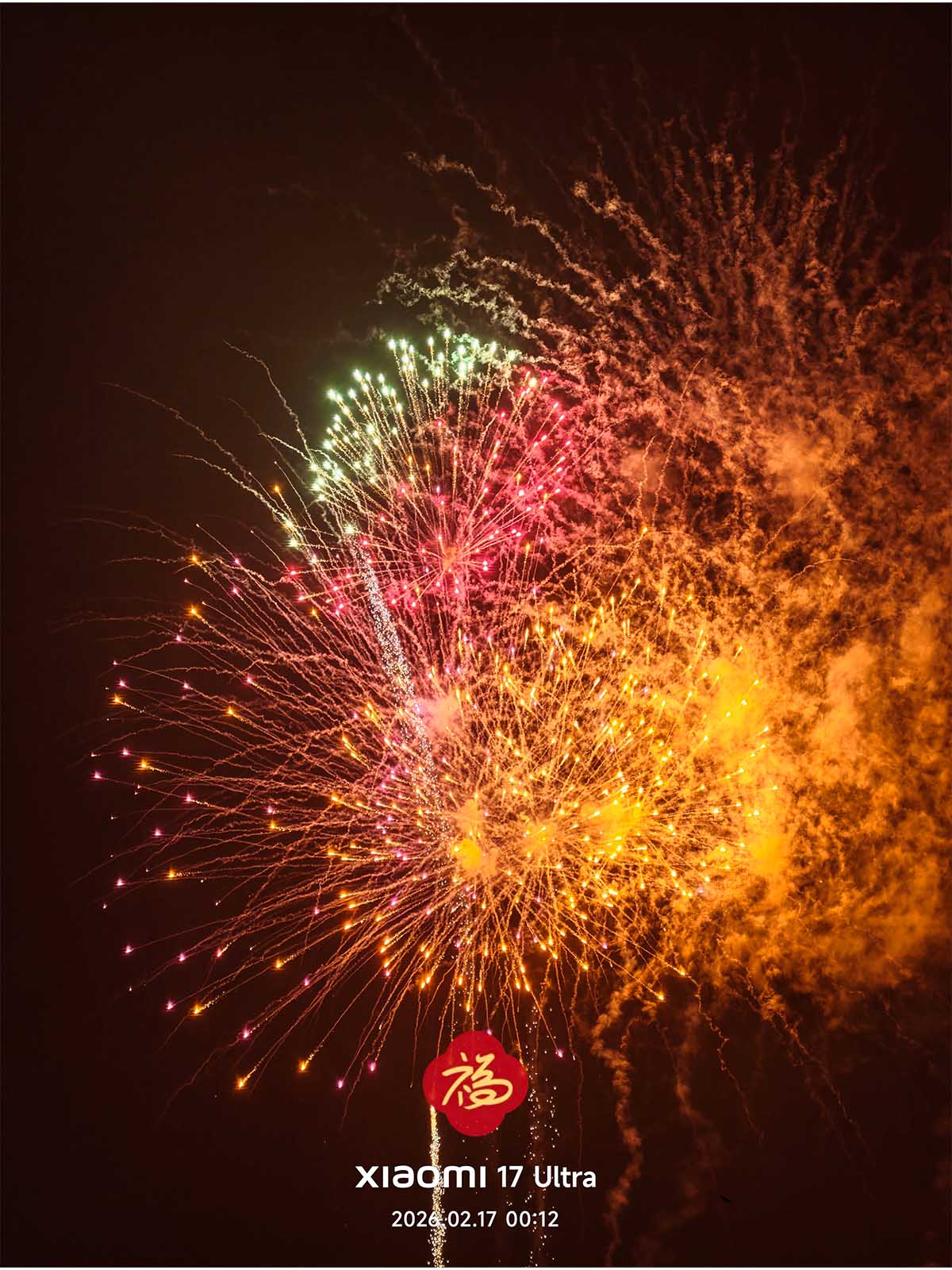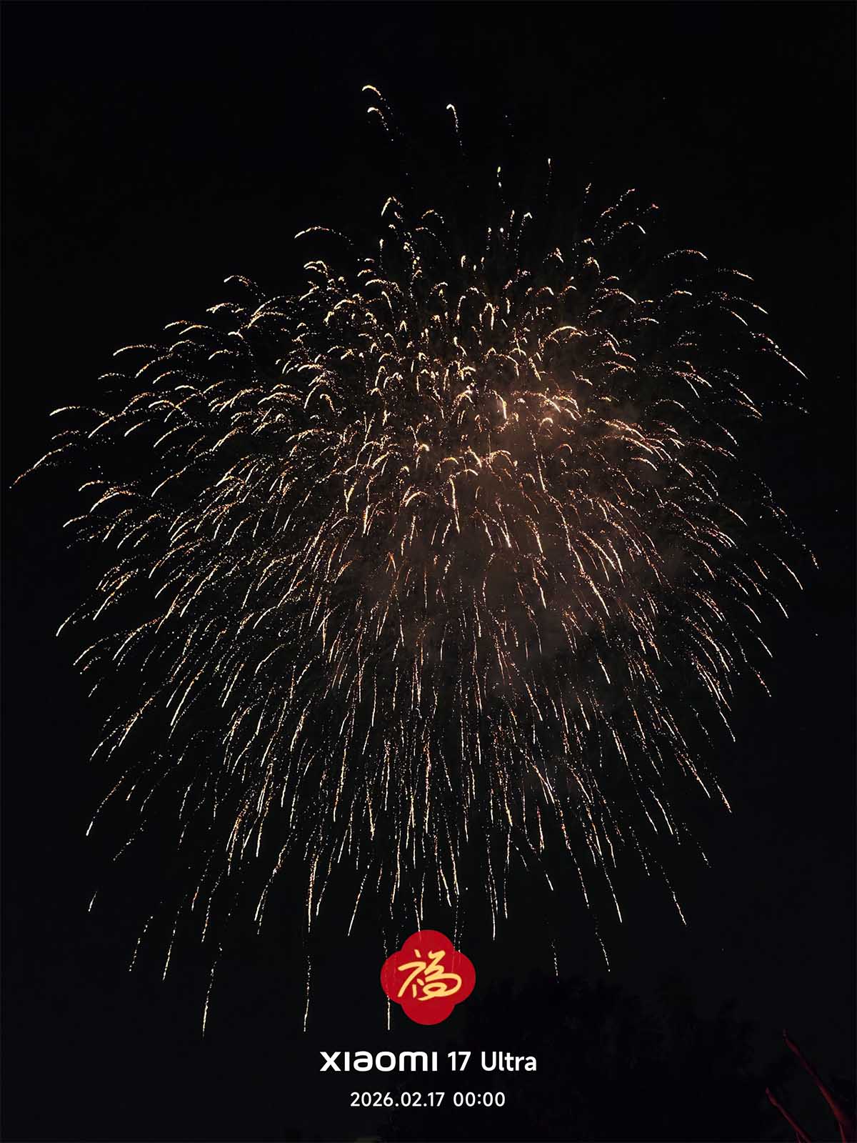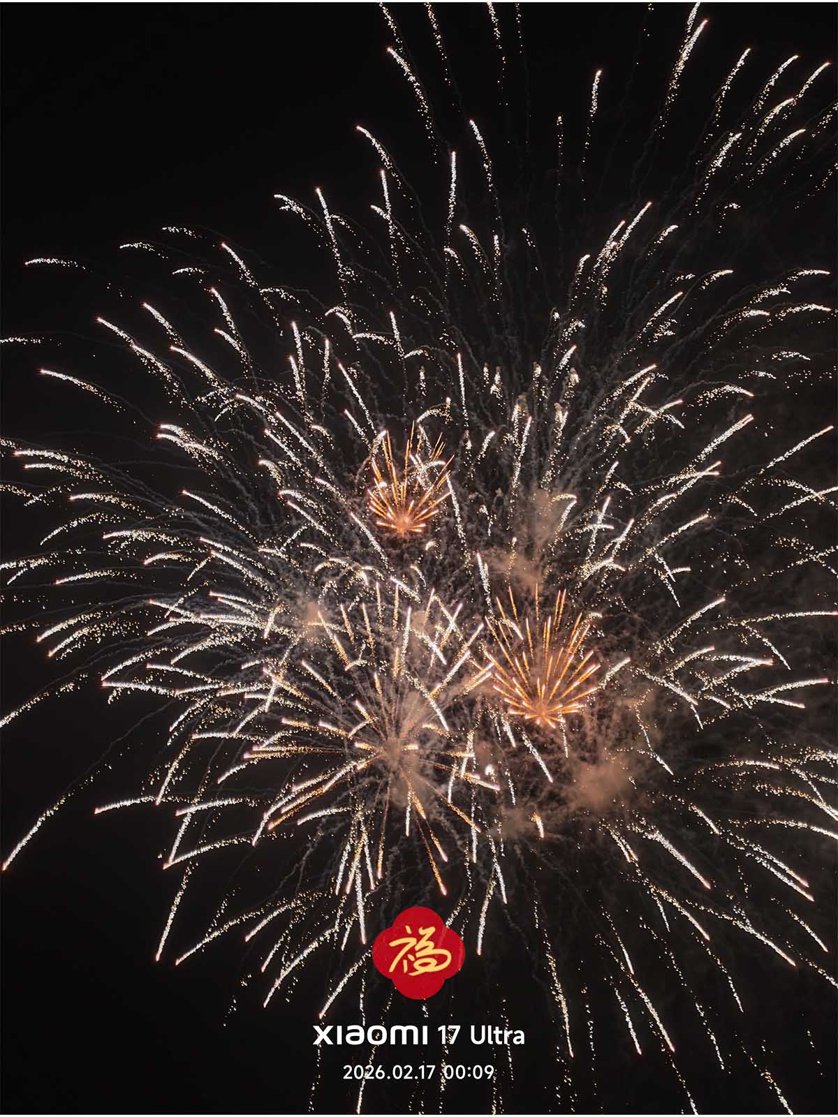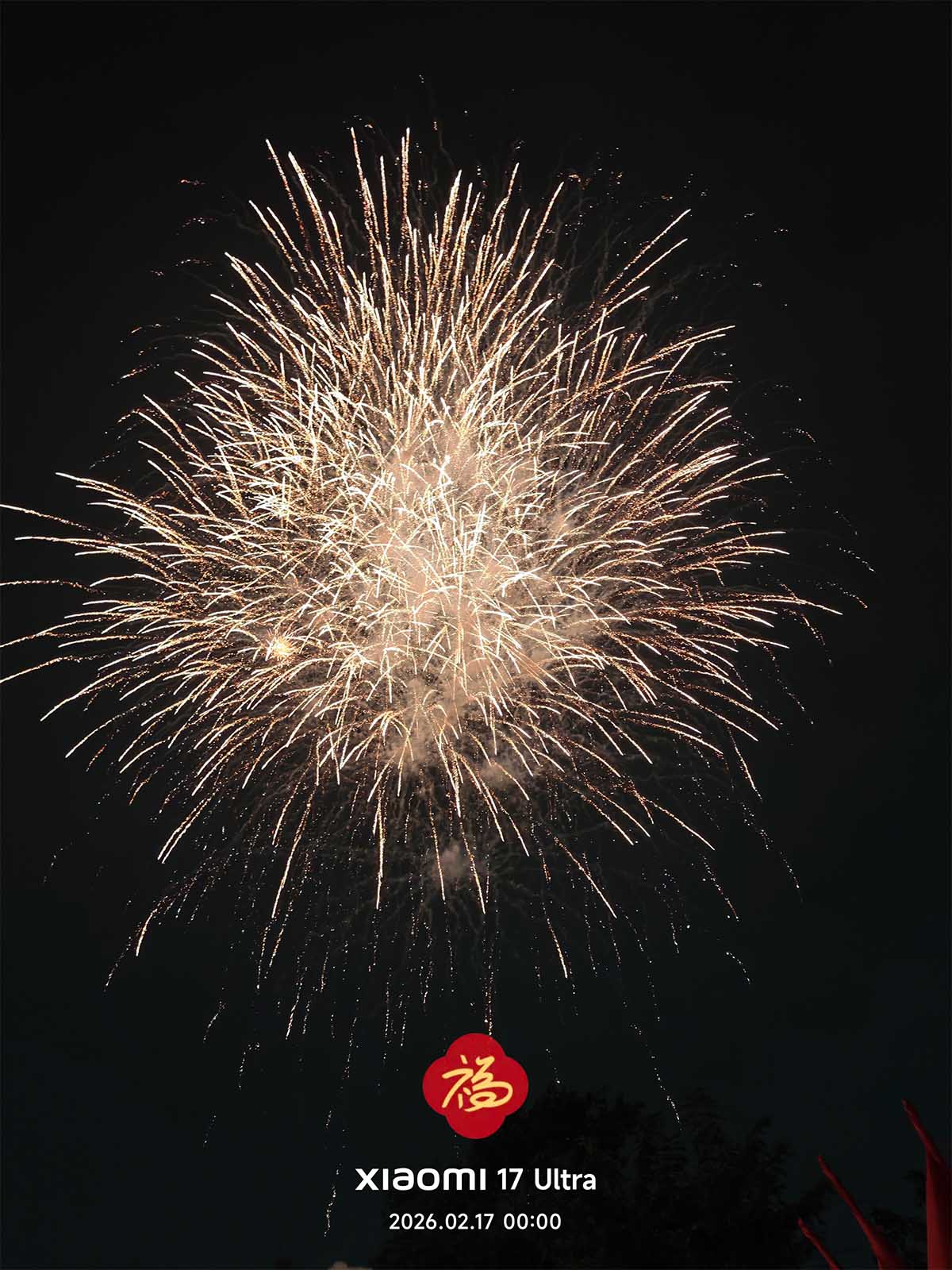 Nhờ khả năng can thiệp thông số chính xác, Xiaomi 17 Ultra cho ra những bức ảnh chụp pháo hoa có chất lượng xuất sắc. Tốc độ lưu ảnh và xử lý thuật toán của hệ thống diễn ra rất nhanh. Bằng cách “đóng băng” khoảnh khắc, các đường sáng kéo dài, vân pháo hoa rực rỡ hay phần khói mờ ảo phía sau đều được tái tạo một cách rõ nét, cân bằng hài hòa cùng với độ sâu của nền trời đêm.