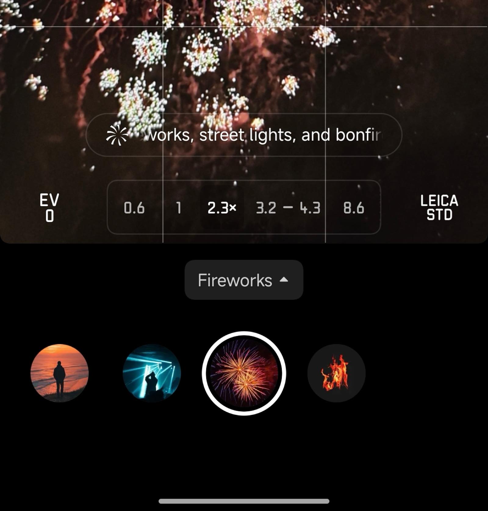 Để kích hoạt chế độ chụp pháo hoa chuyên dụng trên Xiaomi 17 Ultra, người dùng chỉ cần thao tác vô cùng đơn giản. Trong giao diện mặc định, bạn sẽ nhận thấy một biểu tượng mũi tên nhỏ nằm dưới đề mục ảnh. Khi nhấn vào, hệ thống cung cấp loạt tùy chọn bối cảnh nhằm tối ưu hóa thuật toán. Bạn có thể chọn bối cảnh tại concert, ngọn lửa hay pháo hoa. Trong khoảnh khắc đón Giao thừa, mình đã chọn ngay chế độ pháo hoa để trải nghiệm.